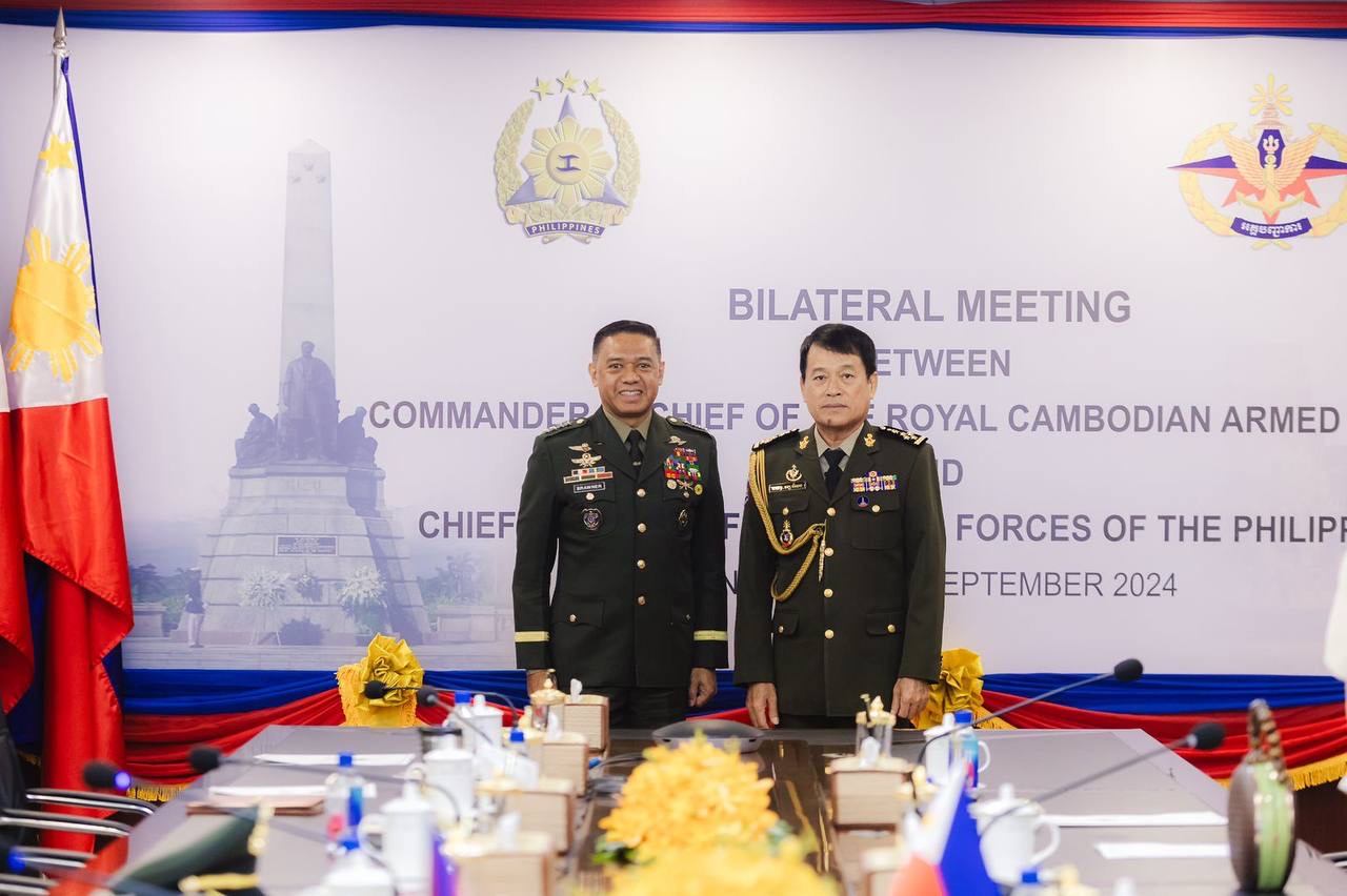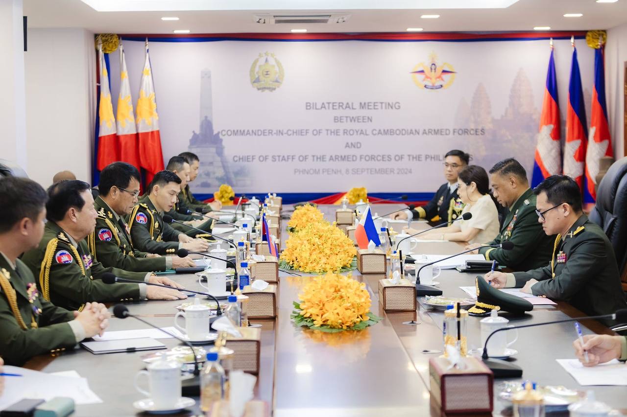 (ភ្នំពេញ)៖ នាព្រឹកថ្ងៃទី៨ ខែកញ្ញា ឆ្នាំ២០២៤ នាយឧត្តមសេនីយ៍ វង្ស ពិសេន អគ្គមេបញ្ជាការនៃកងយោធពលខេមរភូមិន្ទ និងនាយឧត្តមសេនីយ៍ រ៉ូមេអូ អេស ប្រាវនើ ជេអ នាយសេនាធិការកងទ័ពហ្វីលីពីន បានជួបពិភាក្សាការងារទ្វេភាគី ក្នុងឱកាសដែលនាយឧត្តមសេនីយ៍ ដឹកនាំគណៈប្រតិភូកងទ័ពហ្វីលីពីនមកបំពេញទស្សនកិច្ចនៅព្រះរាជាណាចក្រកម្ពុជា។