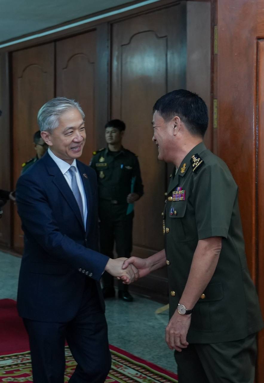 (ភ្នំពេញ)៖ ឯកឧត្តម នាយឧត្តមសេនីយ៍ វង្ស ពិសេន អគ្គមេបញ្ជាការនៃកងយោធពលខេមរភូមិន្ទ នារសៀលថ្ងៃទី១៨ ខែកញ្ញា ឆ្នាំ២០២៤នេះ បានទទួលជួបសម្តែងការគួរសម និងពិភាក្សាការងារជាមួយ ឯកឧត្ដម វ៉ាង វិនពីន (Wang Wenbin) ឯកអគ្គរដ្ឋទូតថ្មីនៃសាធារណរដ្ឋប្រជាមានិតចិនប្រចាំកម្ពុជា នៅអគ្គបញ្ជាការដ្ឋាន។