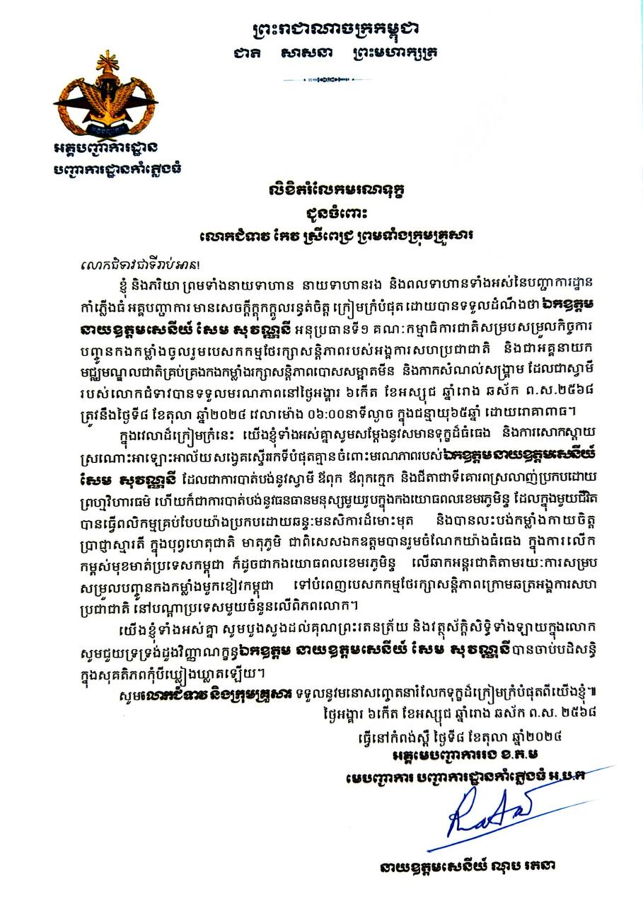 (ភ្នំពេញ)៖ ឯកឧត្ដម នាយឧត្តមសេនីយ៍ សាស្រ្តាចារ្យ បណ្ឌិត ណុប រតនា អគ្គមេបញ្ជាការរង នៃកងយោធពលខេមរភូមិន្ទ និងជាមេបញ្ជាការ បញ្ជាការដ្ឋានកាំភ្លើងធំ អគ្គបញ្ជាការ ព្រមទាំងនាយទាហាន នាយទាហានរង ពលទាហានទាំងអស់ ផ្ញើសាររំលែកទុក្ខជូនលោកជំទាវ កែវ ស្រីពេជ្រ ចំពោះមរណភាព ឯកឧត្ដម នាយឧត្ដមសេនីយ៍ សែម សុវណ្ណនី អគ្គនាយកមជ្ឈមណ្ឌលជាតិគ្រប់គ្រងកងកម្លាំងរក្សាសន្តិភាព បោសសំអាតមីន និងកាកសំណល់សង្គ្រាម ដែលត្រូវជាស្វាមីរបស់លោកជំទាវ បានទទួលមរណភាពនៅវេលា ម៉ោង៦ល្ងាច ថ្ងៃអង្គារ ៦កើត ខែអស្សុជ ឆ្នាំរោង ឆស័ក ព.ស.២៥៦៨ ត្រូវនឹងថ្ងៃទី៨ ខែតុលា ឆ្នាំ២០២៤ ក្នុងជន្មាយុ៦៥ឆ្នាំ ដោយរោគាពាធ។
