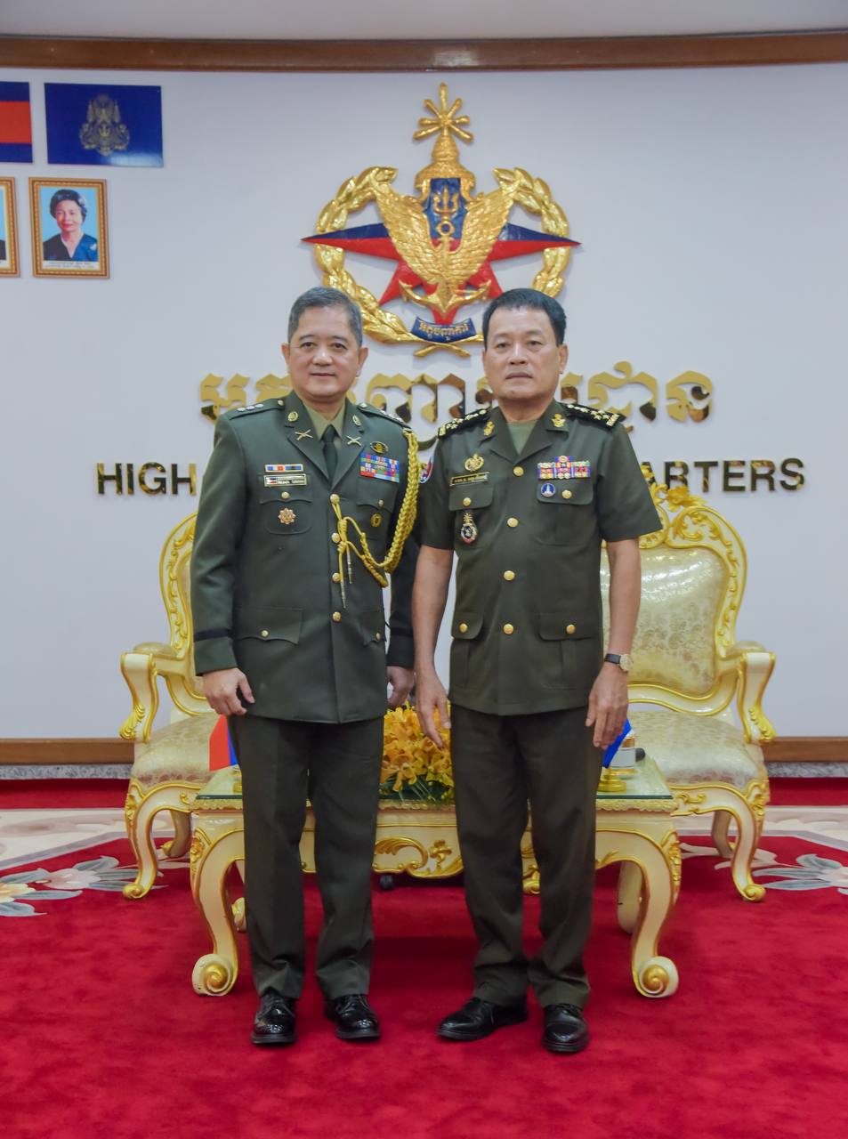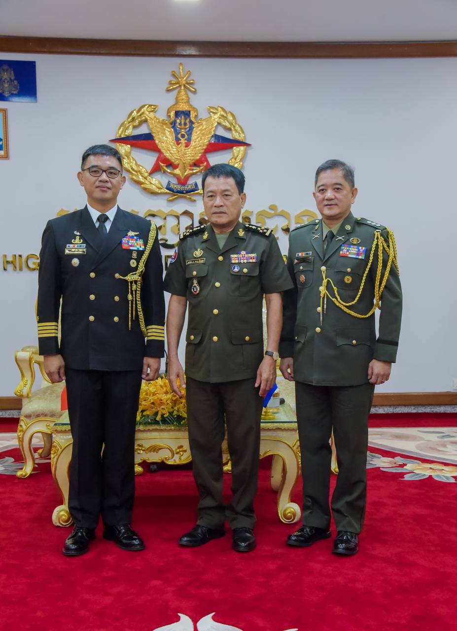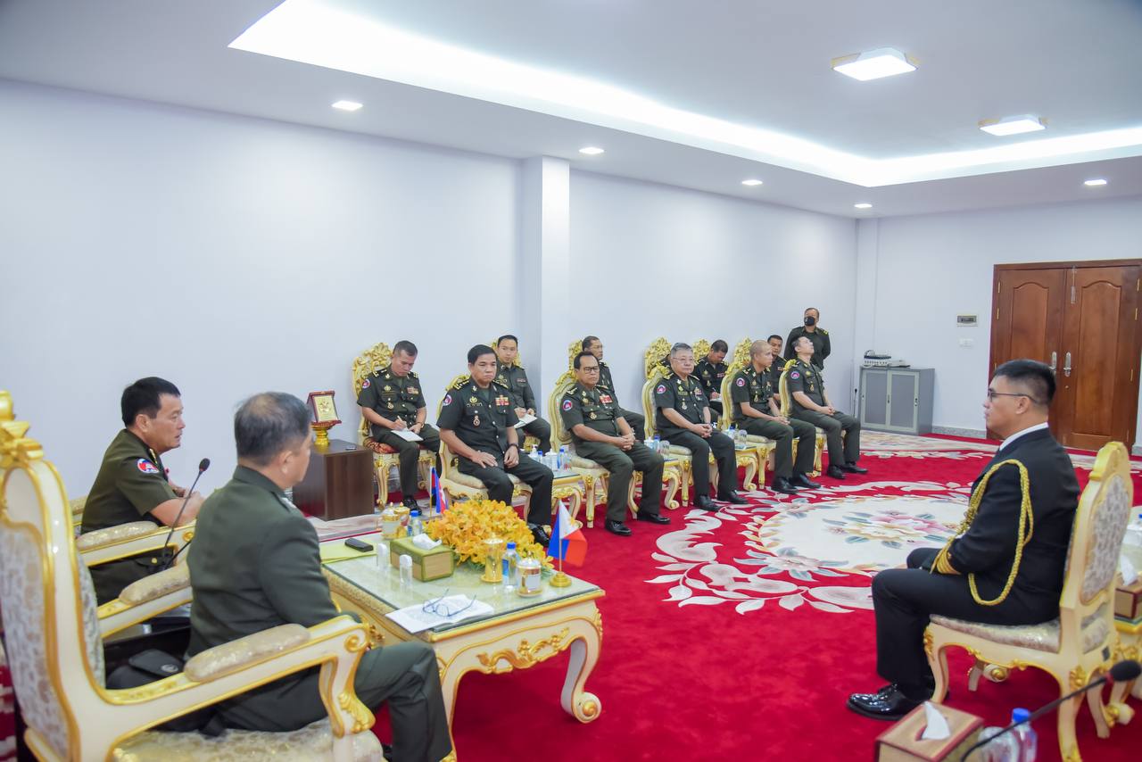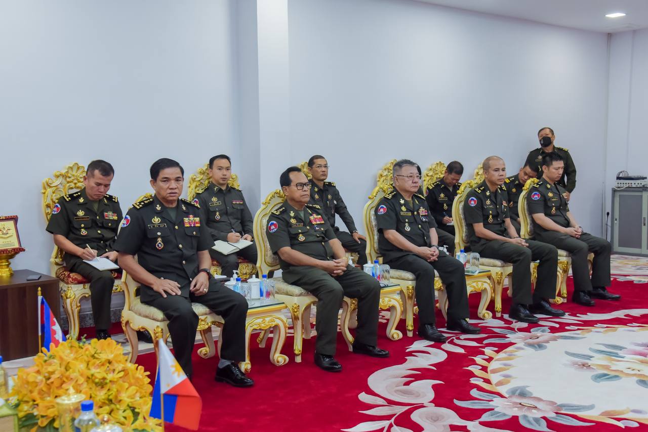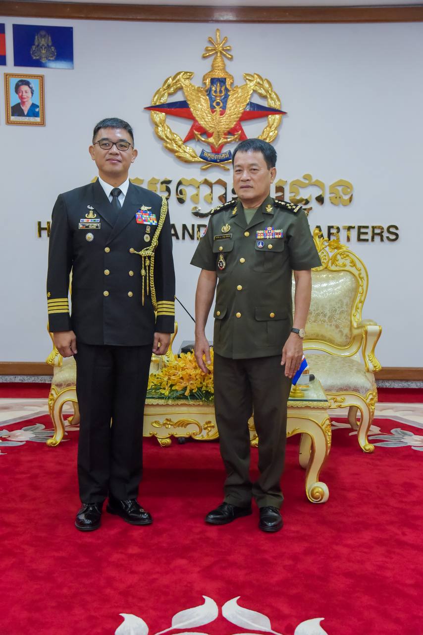 (ភ្នំពេញ)៖ នាយឧត្តមសេនីយ៍ វង្ស ពិសេន អគ្គមេបញ្ជាការ នៃកងយោធពលខេមរភូមិន្ទ បានអនុញ្ញាតឱ្យ វរសេនីយ៍ឯក SHALIMAR R IMPERIAL នាយការិយាល័យអនុព័ន្ធយោធាហ្វីលីពីនប្រចាំកម្ពុជាចប់អាណត្តិ និង វរនាវីឯក LEO C.DIMOC នាយការិយាល័យអនុព័ន្ធយោធាហ្វីលីពីនតែងតាំងថ្មី ចូលជួបសម្តែងការគួរសម នាព្រឹកថ្ងៃទី២៦ ខែឧសភា ឆ្នាំ២០២៣ នៅអគ្គបញ្ជាការដ្ឋាន។