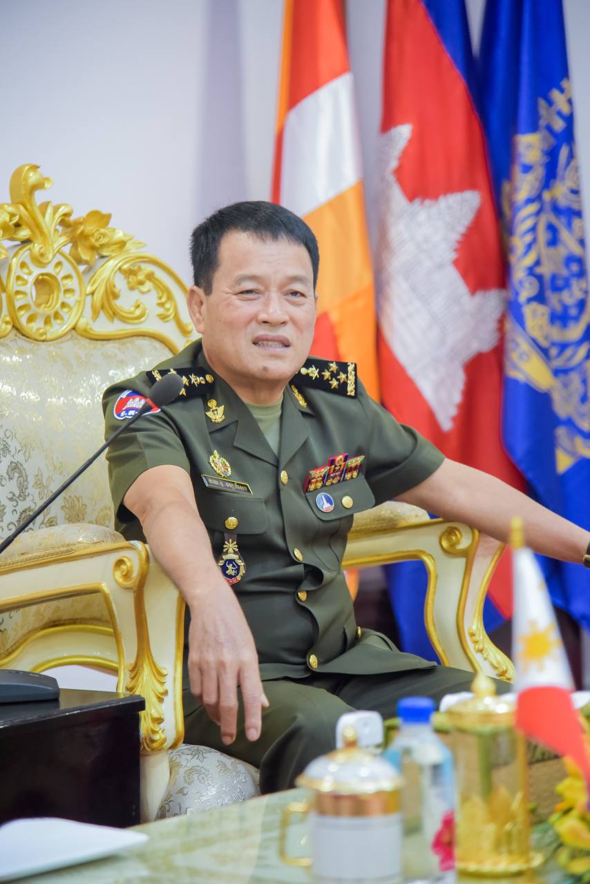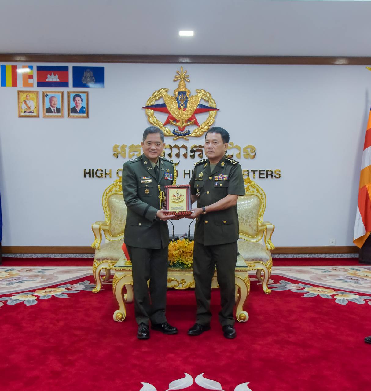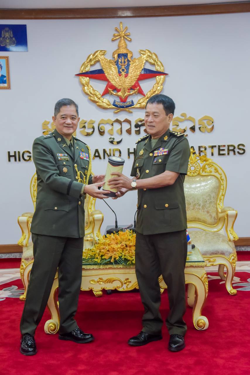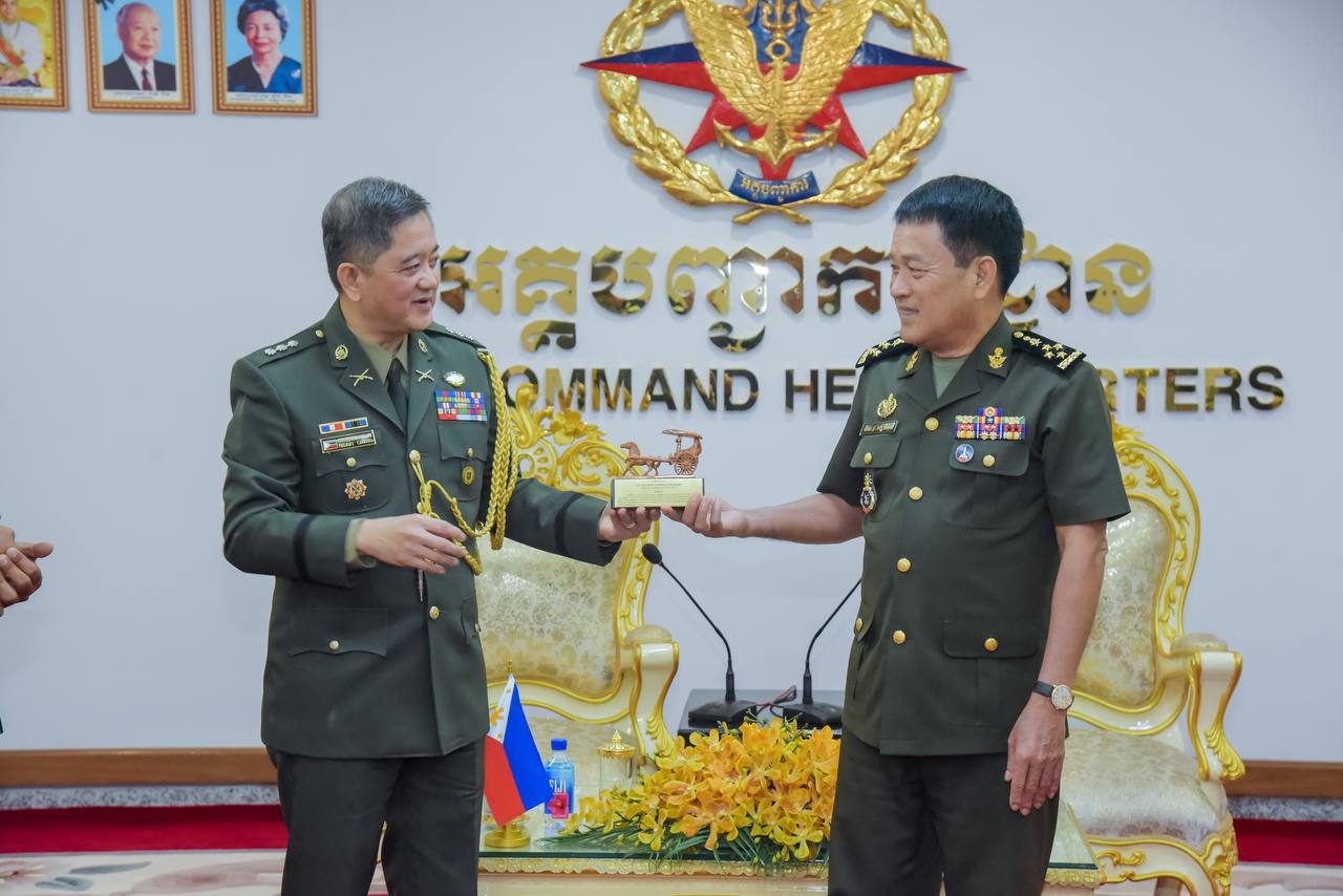 (ភ្នំពេញ)៖ នាយឧត្តមសេនីយ៍ វង្ស ពិសេន អគ្គមេបញ្ជាការ នៃកងយោធពលខេមរភូមិន្ទ បានអនុញ្ញាតឱ្យ វរសេនីយ៍ឯក SHALIMAR R IMPERIAL នាយការិយាល័យអនុព័ន្ធយោធាហ្វីលីពីនប្រចាំកម្ពុជាចប់អាណត្តិ និង វរនាវីឯក LEO C.DIMOC នាយការិយាល័យអនុព័ន្ធយោធាហ្វីលីពីនតែងតាំងថ្មី ចូលជួបសម្តែងការគួរសម នាព្រឹកថ្ងៃទី២៦ ខែឧសភា ឆ្នាំ២០២៣ នៅអគ្គបញ្ជាការដ្ឋាន។