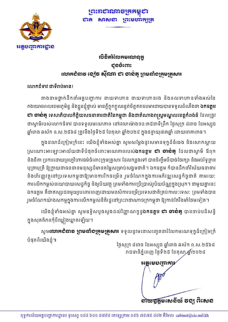 (ភ្នំពេញ)៖ នាយឧត្តមសេនីយ៍ វង្ស ពិសេន អគ្គមេបញ្ជាការ នៃកងយោធពលខេមរភូមិន្ទ ព្រមទាំងនាយទាហាន នាយទាហានរង និងពលទាហានទាំងអស់ នៃកងយោធពលខេមរភូមិន្ទ បានផ្ញើសារចូលរួមរំលែកមរណទុក្ខយ៉ាងក្រៀមក្រំបំផុត និងមានការសោកស្ដាយក្រៃលែងជាមួយលោកជំទាវ ខៀវ ស៊ីណា ចំពោះមរណភាពរបស់ឯកឧត្តម ជា ចាន់តូ តំណាងរាស្រ្តមណ្ឌលខេត្តកំពង់ធំ និងជាអគ្គទេសាភិបាលកិត្តិយសធនាគារជាតិនៃកម្ពុជា ដែលត្រូវជាស្វាមីរបស់លោកជំទាវ បានទទួលមរណភាព នៅថ្ងៃសុក្រ ៨រោច ខែអស្សុជ ឆ្នាំរោង ឆស័ក ព.ស.២៥៦៨ ត្រូវនឹងថ្ងៃទី២៥ ខែតុលា ឆ្នាំ២០២៤ វេលាម៉ោង ១០:៣៥នាទីព្រឹក ក្នុងជន្មាយុ ៧៣ឆ្នាំ ដោយរោគាពាធ។