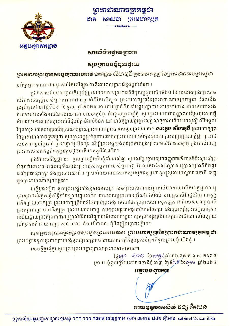 (ភ្នំពេញ)៖ នាយឧត្តមសេនីយ៍ វង្ស ពិសេន អគ្គមេបញ្ជាការនៃកងយោធពលខេមរភូមិន្ទ ព្រមទាំងនាយទាហាន នាយទាហានរង និងពលទាហានទាំងអស់នៃកងយោធពលខេមរភូមិន្ទ សូមក្រាបបង្គំទូលថ្វាយ និង សូមបរមរាជានុញ្ញាតសម្តែងនូវអំណរសាទររំភើបរីករាយយ៉ាងក្រៃលែង ប្រកបដោយកតញ្ញុតាធម៌ ដ៏ស្មោះស្ម័គ្របំផុតថ្វាយ ព្រះករុណាព្រះបាទសម្តេច ព្រះបរមនាថ នរោត្តម សីហមុនី ព្រះមហាក្សត្រ នៃព្រះរាជាណាចក្រកម្ពុជា ជាទីគោរពសក្ការៈដ៏ខ្ពង់ខ្ពស់បំផុត នៅក្នុងឱកាសដ៏មហាមង្គលាភិរម្យថ្លៃថ្លា នៃព្រះរាជពិធីគ្រងព្រះបរមរាជសម្បត្តិគម្រប់២០ព្រះវស្សា ដែលប្រព្រឹត្តទៅនៅ ថ្ងៃអង្គារ ១២រោច ខែអស្សុជ ឆ្នាំរោង ឆស័ក ព.ស. ២៥៦៨ ត្រូវនឹងថ្ងៃទី២៩ ខែតុលា ឆ្នាំ២០២៤។