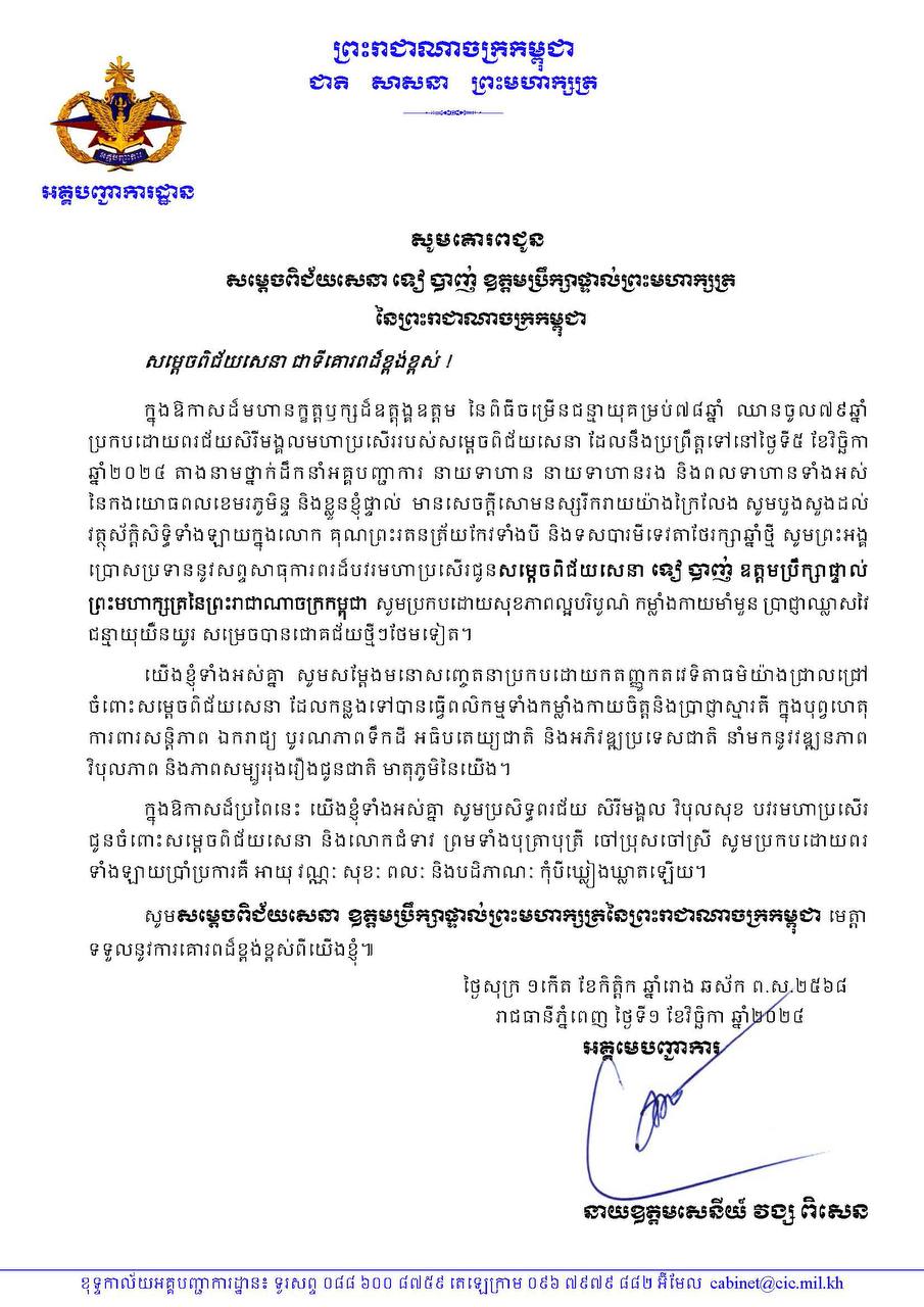 (ភ្នំពេញ)៖ ក្នុងឱកាសដ៏នក្ខត្តឫក្សដ៏ឧត្ដុង្គឧត្ដមនៃពិធីចម្រើនជន្មាយុ សម្តេចពិជ័យសេនា ទៀ បាញ់ ឧត្តមប្រឹក្សាផ្ទាល់ព្រះមហាក្សត្រនៃព្រះរាជាណាចក្រកម្ពុជា គម្រប់ ៧៨ឆ្នាំ ឈានចូល ៧៩ឆ្នាំ នាថ្ងៃទី៥ ខែវិច្ឆិកា ឆ្នាំ២០២៤, ឯកឧត្ដម នាយឧត្ដមសេនីយ៍ វង្ស ពិសេន អគ្គមេបញ្ជាការនៃកងយោធពលខេមរភូមិន្ទ ព្រមទាំងថ្នាក់ដឹកនាំអគ្គបញ្ជាការ នាយទាហាន នាយទាហានរង និងពលទាហានទាំងអស់នៃកងយោធពលខេមរភូមិន្ទ សូមបួងសួងចំពោះគុណបុណ្យព្រះរតនត្រ័យកែវទាំងបី និងវត្ថុស័ក្តិសិទ្ធិទាំងឡាយក្នុងលោក សូមព្រះអង្គ ប្រោសប្រទាននូវសព្ទសាធុការពរ បវរមហាប្រសើរជូន សម្តេចពិជ័យសេនា ទៀ បាញ់ ឧត្តមប្រឹក្សាផ្ទាល់ព្រះមហាក្សត្រនៃព្រះរាជាណាចក្រកម្ពុជា