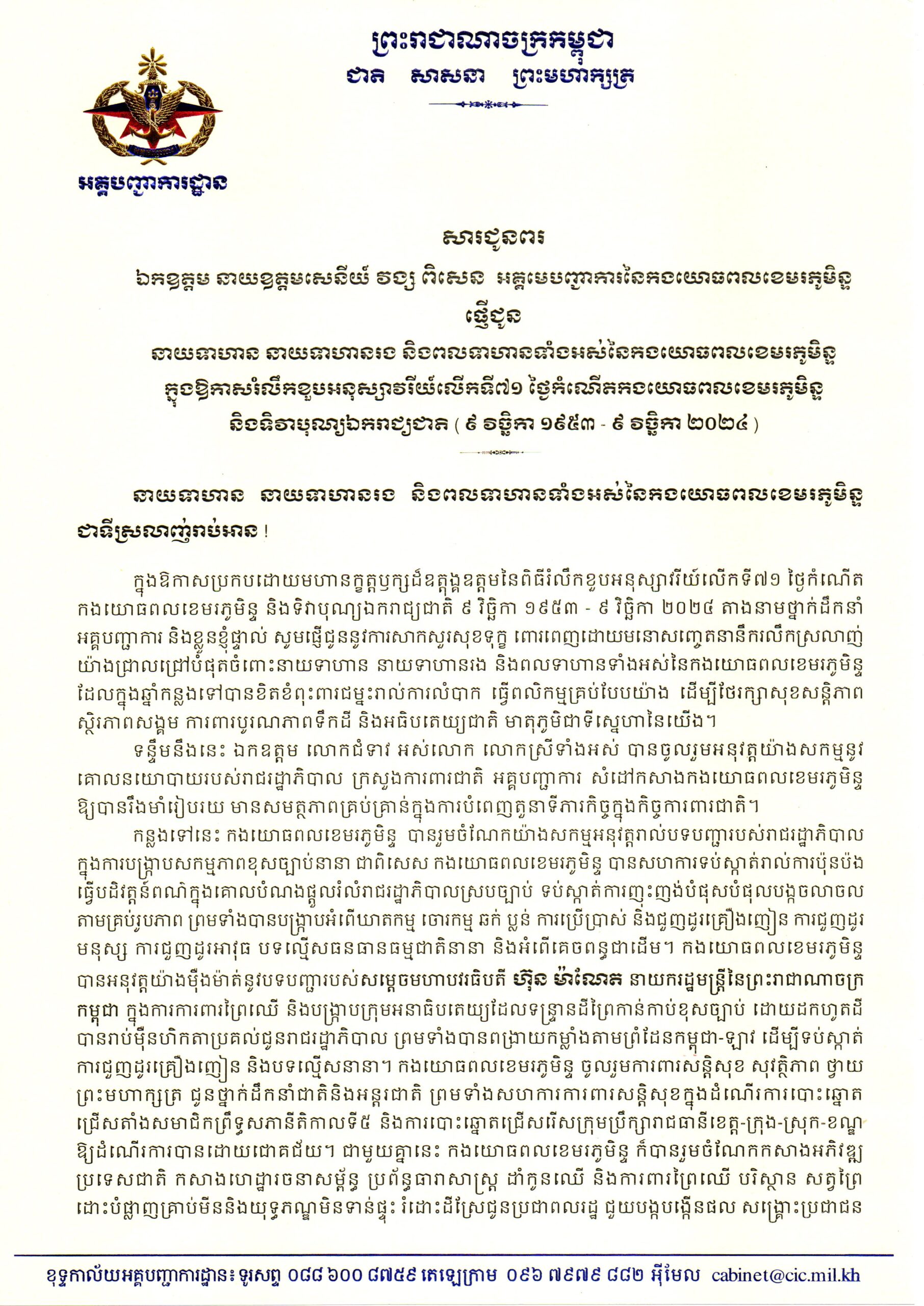 (ភ្នំពេញ)៖ ឯកឧត្តម នាយឧត្តមសេនីយ៍ វង្ស ពិសេន អគ្គមេបញ្ជាការ នៃកងយោធពលខេមរភូមិន្ទ ផ្ញើសារជូនពរជូននាយទាហាន នាយទាហានរង និងពលទាហានទាំងអស់នៃកងយោធពលខេមរភូមិន្ទ ក្នុងឱកាសរំលឹកខួបអនុស្សាវរីយ៍លើកទី៧១ ថ្ងៃកំណើតកងយោធពលខេមរភូមិន្ទ និងទិវាបុណ្យឯករាជ្យជាតិ (៩ វិច្ឆិកា ១៩៥៣ – ៩ វិច្ឆិកា ២០២៤)។