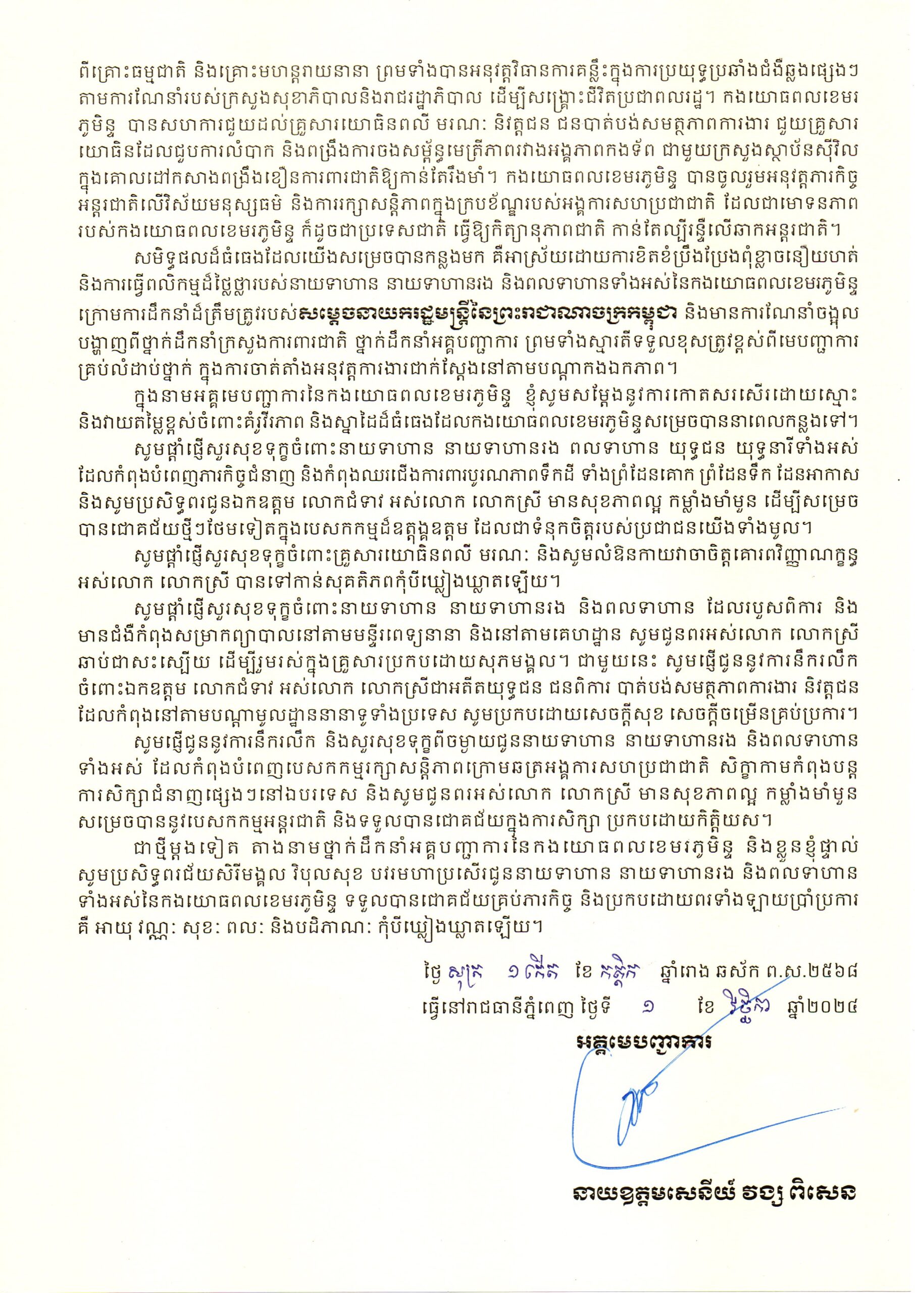 ខាងក្រោមជាខ្លឹមសារទាំងស្រុងនៃសារជូនពររបស់ ឯកឧត្តម នាយឧត្តមសេនីយ៍ អគ្គមេបញ្ជាការ កងយោធពលខេមរភូមិន្ទ៖