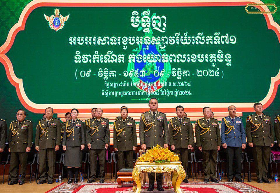 (ភ្នំពេញ)៖ ឯកឧត្ដម នាយឧត្ដមសេនីយ៍ វង្ស ពិសេន អគ្គមេបញ្ជាការ កងយោធពលខេមរភូមិន្ទ នៅថ្ងៃទី៨ ខែវិច្ឆិកា ឆ្នាំ២០២៤ បានអញ្ជើញចូលរួមជាគណៈអធិបតីក្នុងពិធីមិទ្ទីញអបអរសាទរខួបអនុស្សាវរីយ៍លើកទី៧១ ទិវាកំណើត កងយោធពលខេមរភូមិន្ទ (០៩ វិច្ឆិកា ១៩៥៣ – ០៩ វិច្ឆិកា ២០២៤) ក្រោមអធិបតីភាព ឯកឧត្តម នាយឧត្តមសេនីយ៍ ទៀ សីហា ឧបនាយករដ្ឋមន្រ្តី រដ្ឋមន្រ្តីក្រសួងការពារជាតិ៕