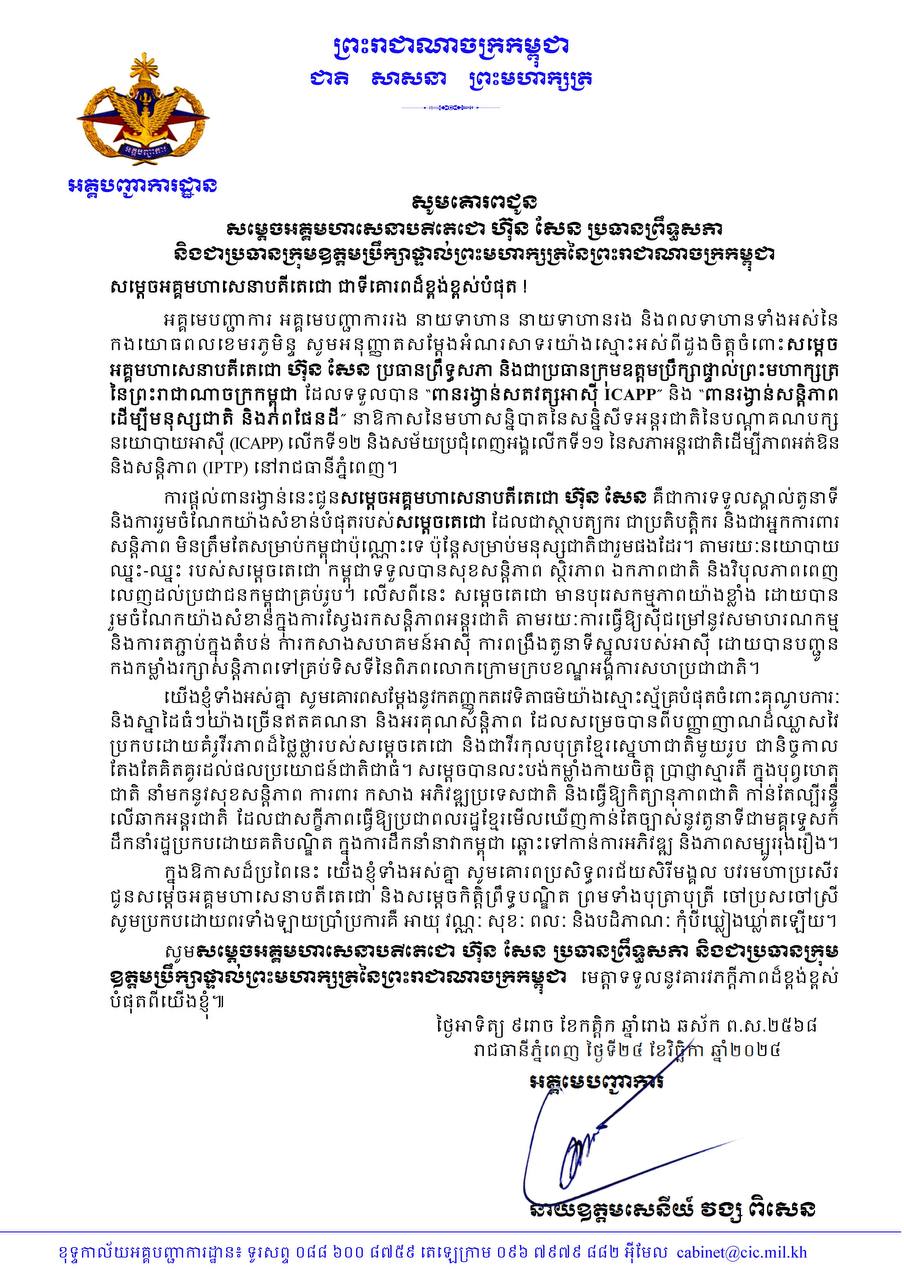 (ភ្នំពេញ)៖ ឯកឧត្ដម នាយឧត្តមសេនីយ៍ វង្ស ពិសេន អគ្គមេបញ្ជាការនៃកងយោធពលខេមរភូមិន្ទ ព្រមទាំងថ្នាក់ដឹកនាំ នាយទាហាន នាយទាហានរង និងពលទាហានទាំងអស់នៃកងយោធពលខេមរភូមិន្ទ សូមគោរពអបអរសាទរយ៉ាងស្មោះអស់ពីដួងចិត្តជូន សម្តេចអគ្គមហាសេនាបតីតេជោ ហ៊ុន សែន ប្រធានព្រឹទ្ធសភា និងជាប្រធានក្រុមឧត្តមប្រឹក្សាផ្ទាល់ព្រះមហាក្សត្រនៃព្រះរាជាណាចក្រកម្ពុជា ដែលត្រូវបាន សភាអន្តរជាតិដើម្បីការអត់ឱន និងសន្តិភាព (IPTP) នៃក្រុមប្រឹក្សាសកលដើម្បីការអត់ឱន និងសន្តិភាព (GCTP) ប្រគល់ «ពានរង្វាន់មេដាយសន្តិភាព ដើម្បីមនុស្សជាតិ និងភពផែនដី» នាឱកាសដ៏មហានក្ខត្តឫក្ស នៃសម័យប្រជុំពេញអង្គលើកទី១១ របស់ IPTP ដែលប្រព្រឹត្តទៅពីថ្ងៃទី ២៣-២៥ ខែវិច្ឆិកា ឆ្នាំ២០២៤ នៅរាជធានីភ្នំពេញ។