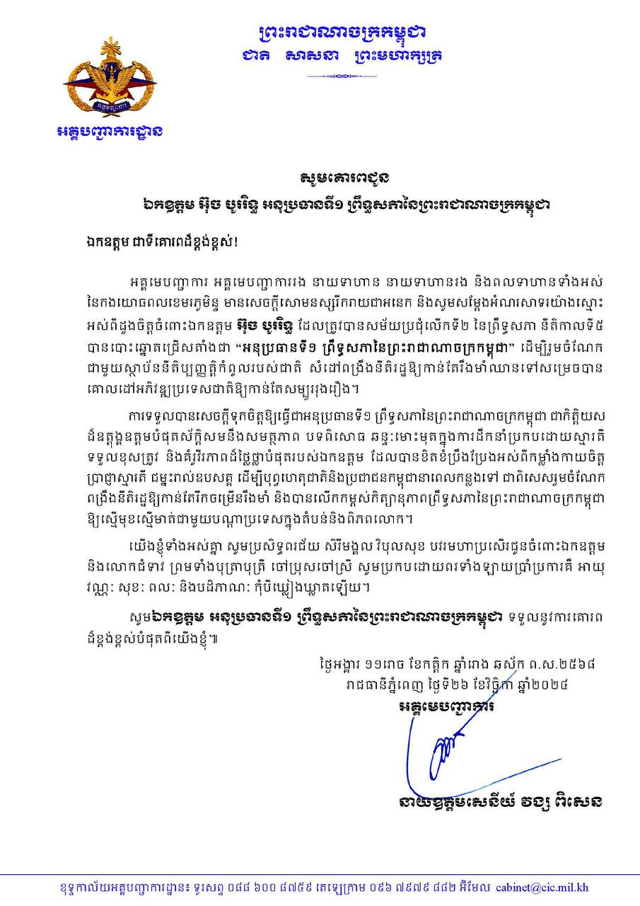 (ភ្នំពេញ)៖ នាយឧត្តមសេនីយ៍ វង្ស ពិសេន អគ្គមេបញ្ជាការនៃកងយោធពលខេមរភូមិន្ទ ព្រមទាំងនាយទាហាន នាយទាហានរង និងពលទាហានទាំងអស់នៃកងយោធពលខេមរភូមិន្ទ បានសម្តែងនូវមនោសញ្ចេតនាយ៉ាងជ្រាលជ្រៅ ព្រមជាមួយអំណរសាទរយ៉ាងក្រៃលែងជូនចំពោះ ឯកឧត្តម អ៊ុច បូររិទ្ធ ដែលត្រូវបានព្រឹទ្ធសភាបោះឆ្នោតជ្រើសរើសជា «អនុប្រធានទី១ ព្រឹទ្ធសភា» ក្នុងសម័យប្រជុំលើកទី២ ព្រឹទ្ធសភា ក្រោមអធិបតីភាពដ៏ខ្ពង់ខ្ពស់របស់ សម្តេចអគ្គមហាសេនាបតីតេជោ ហ៊ុន សែន ប្រធានព្រឹទ្ធសភា នារសៀល ថ្ងៃទី២៥ ខែវិច្ឆិកា ឆ្នាំ២០២៤។