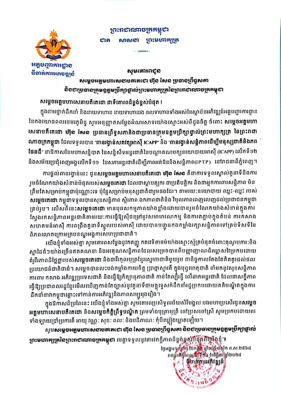 យើងខ្ញុំទាំងអស់គ្នា សូមគោរពសម្តែងនូវ កតញ្ញូ កតវេទិតាធម៌យ៉ាងស្មោះស្ម័គ្របំផុត ចំពោះគុណូបការៈ និងស្នាដៃធំៗយ៉ាងច្រើនឥតគណនា និងអរគុណសន្តិភាពដែលសម្រេចបានពីបញ្ញាញាណដ៏ឈ្លាសវៃ ប្រកបដោយគំរូវីរភាពដ៏ថ្លៃថ្លា របស់សម្ដេចតេជោ និងជាវីរកុលបុត្រ ខ្មែរស្នេហាជាតិមួយរូបជានិច្ចកាលតែង តែគិតគូរដល់ផលប្រយោជន៍ជាតិជាធំ។ សម្តេច បានលះបង់កម្លាំងកាយចិត្ត ប្រាជ្ញាស្មារតី ក្នុងបុព្វហេតុជាតិ នាំមកនូវសុខសន្តិភាព ការពារ កសាង អភិវឌ្ឍ ប្រទេសជាតិ និងធ្វើឱ្យកិត្យានុភាពជាតិ កាន់តែល្បីរន្ទឺលើឆាកអន្តរជាតិ ដែលជាសក្ខីភាព ធ្វើឱ្យប្រជាពលរដ្ឋខ្មែរ មើលឃើញកាន់តែច្បាស់នូវតួនាទីជាមគ្គុទ្ទេសក៍ដឹកនាំរដ្ឋប្រកបដោយគតិបណ្ឌិត ក្នុងការដឹកនាំនាវាកម្ពុជា ឆ្ពោះទៅកាន់ការអភិវឌ្ឍ និងភាពសម្បូររុងរឿង។