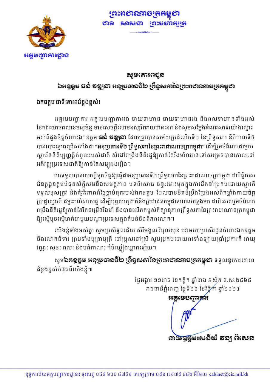 (ភ្នំពេញ)៖ ឯកឧត្តម នាយឧត្តមសេនីយ៍ វង្ស ពិសេន អគ្គមេបញ្ជាការនៃកងយោធពលខេមរភូមិន្ទ ព្រមទាំងនាយទាហាន នាយទាហានរង និងពលទាហានទាំងអស់នៃកងយោធពលខេមរភូមិន្ទ បានសម្តែងនូវមនោសញ្ចេតនាយ៉ាងជ្រាលជ្រៅ ព្រមជាមួយអំណរសាទរយ៉ាងក្រៃលែងជូនចំពោះ ឯកឧត្តម ធន់ វឌ្ឍនា ដែលត្រូវបានព្រឹទ្ធសភាបោះឆ្នោតជ្រើសរើសជា «អនុប្រធានទី២ ព្រឹទ្ធសភា» ក្នុងសម័យប្រជុំលើកទី២ ព្រឹទ្ធសភា ក្រោមអធិបតីភាពដ៏ខ្ពង់ខ្ពស់របស់ សម្តេចអគ្គមហាសេនាបតីតេជោ ហ៊ុន សែន ប្រធានព្រឹទ្ធសភា នារសៀលថ្ងៃទី២៥ ខែវិច្ឆិកា ឆ្នាំ២០២៤។