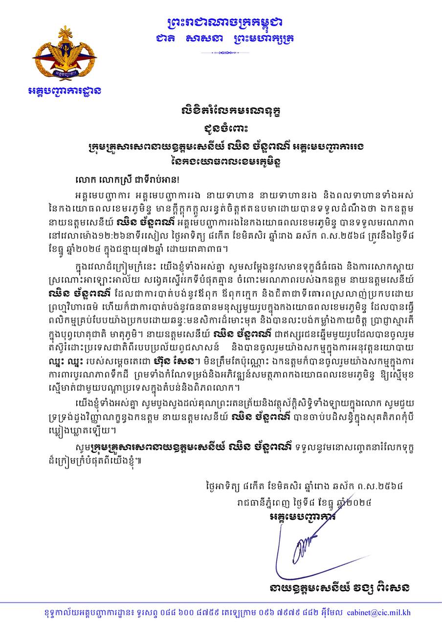 (ភ្នំពេញ)៖ ឯកឧត្ដម នាយឧត្ដមសេនីយ៍ វង្ស ពិសេន អគ្គមេបញ្ជាការ កងយោធពលខេមរភូមិន្ទ ព្រមទាំងថ្នាក់ដឹកនាំ នាយទាហាន នាយទាហានរង និងពលទាហានទាំងអស់នៃកងយោធពលខេមរភូមិន្ទ ផ្ញើសាររំលែកទុក្ខជូន លោកស្រី ច័ន្ទ ចំរើន ចំពោះមរណភាព ឯកឧត្ដម នាយឧត្ដមសេនីយ៍ ឈិន ច័ន្ទពណ៌ អគ្គមេបញ្ជាការរងនៃកងយោធពលខេមរភូមិន្ទ ដែលត្រូវជាឪពុកបង្កើតរបស់លោកស្រី បានទទួលមរណភាពនៅវេលាម៉ោង១២:២៦នាទីរសៀល ថ្ងៃអាទិត្យ ៨កើត ខែមិគសិរ ឆ្នាំរោង ឆស័ក ពុទ្ធសករាជ ២៥៦៨ ត្រូវនឹងថ្ងៃទី៨ ខែធ្នូ ឆ្នាំ២០២៤ ក្នុងជន្មាយុ៧២ឆ្នាំ ដោយរោគាពាធ។