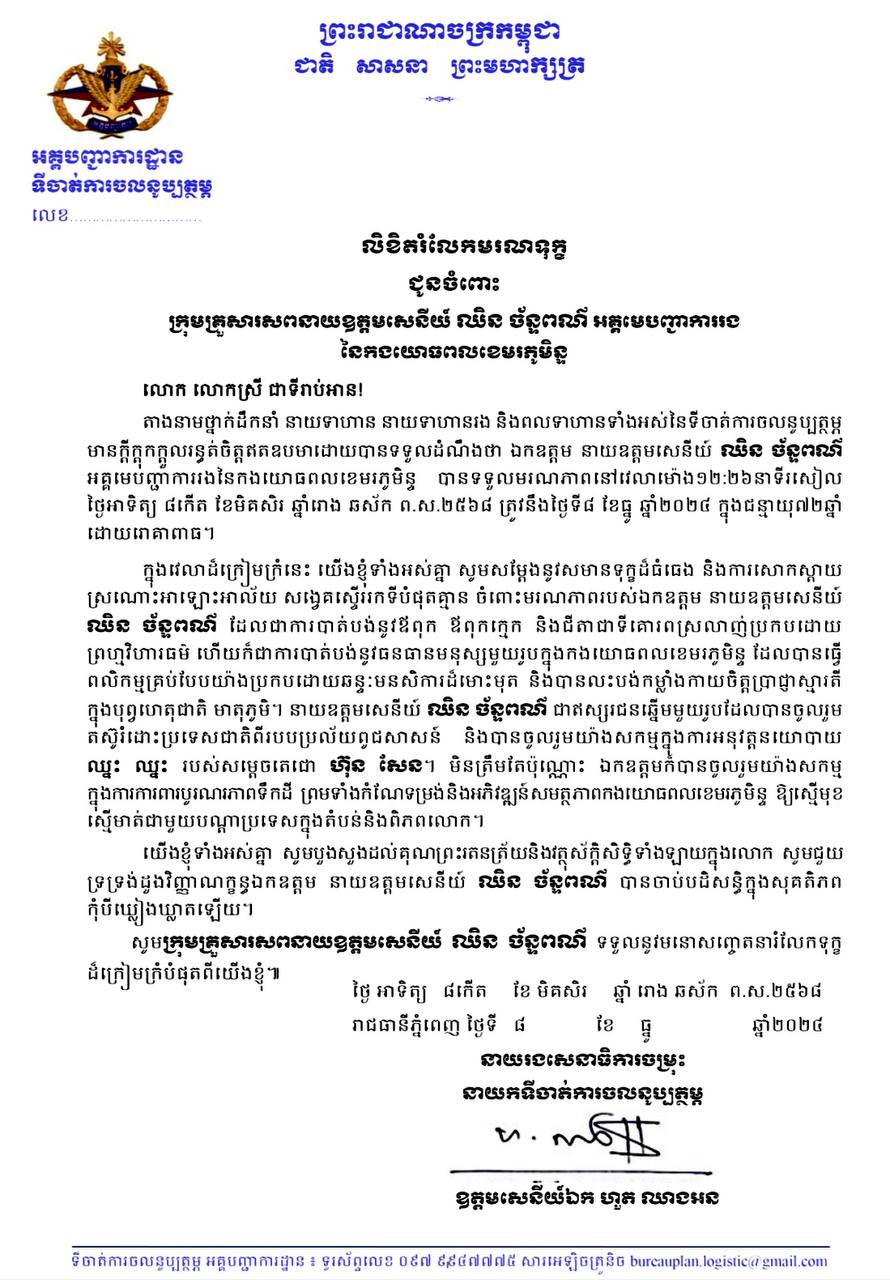 (ភ្នំពេញ)៖ ឯកឧត្ដម ឧត្ដមសេនីយ៍ឯក ហួត ឈាងអន នាយរងសេនាធិការចម្រុះ នាយកទីចាត់ការចលនូប្បត្ថម្ភ អគ្គបញ្ជាការ ព្រមទាំងថ្នាក់ដឹកនាំ នាយទាហាន នាយទាហានរង និងពលទាហានទាំងអស់ ផ្ញើសាររំលែកទុក្ខជូន លោកស្រី ច័ន្ទ ចំរើន ចំពោះមរណភាព ឯកឧត្ដម នាយឧត្ដមសេនីយ៍ ឈិន ច័ន្ទពណ៌ អគ្គមេបញ្ជាការរងនៃកងយោធពលខេមរភូមិន្ទ ដែលត្រូវជាឪពុកបង្កើតរបស់លោកស្រី បានទទួលមរណភាពនៅវេលាម៉ោង១២:២៦នាទីរសៀល ថ្ងៃអាទិត្យ ៨កើត ខែមិគសិរ ឆ្នាំរោង ឆស័ក ពុទ្ធសករាជ ២៥៦៨ ត្រូវនឹងថ្ងៃទី៨ ខែធ្នូ ឆ្នាំ២០២៤ ក្នុងជន្មាយុ៧២ឆ្នាំ ដោយរោគាពាធ។