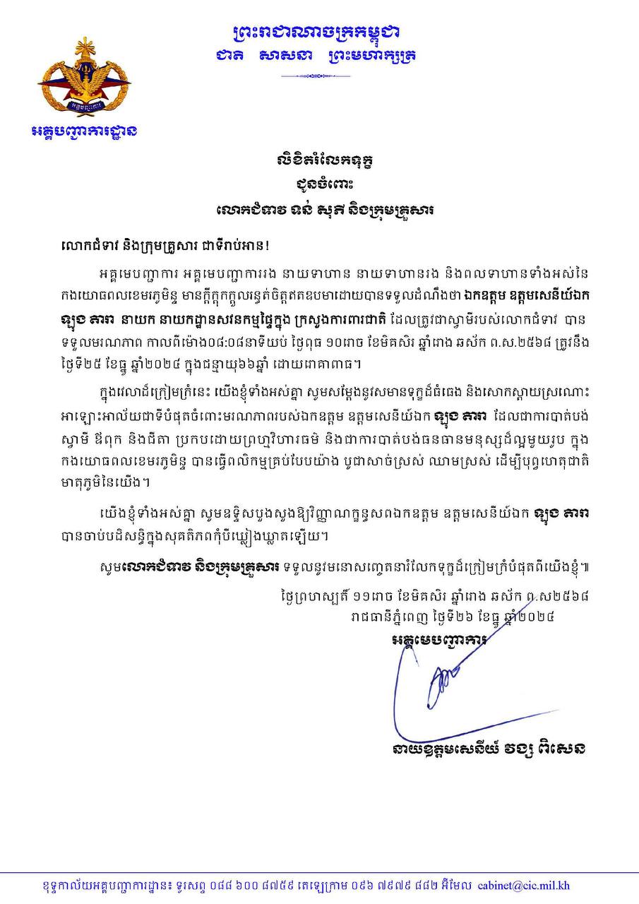 (ភ្នំពេញ)៖ ឯកឧត្ដម នាយឧត្ដមសេនីយ៍ វង្ស ពិសេន អគ្គមេបញ្ជាការ កងយោធពលខេមរភូមិន្ទ ព្រមទាំងថ្នាក់ដឹកនាំ នាយទាហាន នាយទាហានរង និងពលទាហានទាំងអស់នៃកងយោធពលខេមរភូមិន្ទ ផ្ញើសាររំលែកទុក្ខជូនលោកជំទាវ ទន់ សុភីចំពោះមរណភាព ឧត្ដមសេនីយ៍ឯក ឡុង តារា នាយក នាយកដ្ឋានសវនកម្មផ្ទៃក្នុង ក្រសួងការពារជាតិ ដែលត្រូវជាស្វាមីរបស់លោកជំទាវ បានទទួលមរណភាពនៅវេលាម៉ោង៨:០៨នាទី យប់ថ្ងៃទី២៥ ខែធ្នូ ឆ្នាំ២០២៤ ក្នុងជន្មាយុ៦៦ឆ្នាំ ដោយរោគាពាធ។