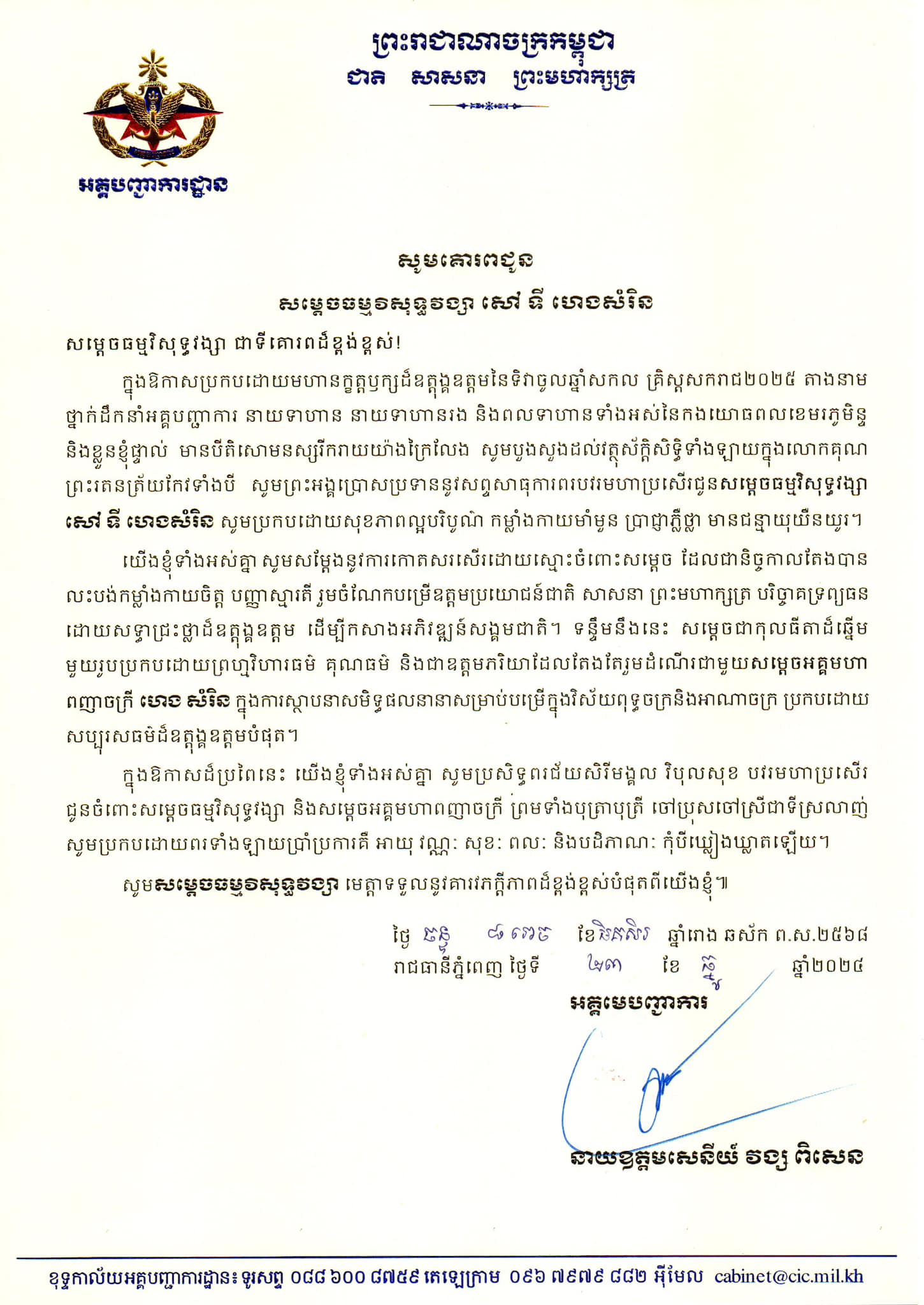 (ភ្នំពេញ)៖ ឯកឧត្ដម នាយឧត្ដមសេនីយ៍ វង្ស ពិសេន អគ្គមេបញ្ជាការនៃកងយោធពលខេមរភូមិន្ទ ព្រមទាំងនាយទាហាន នាយទាហានរង និងពលទាហានទាំងអស់នៃកងយោធពលខេមរភូមិន្ទ បានផ្ញើសារលិខិតគោរពជូនពរ សម្ដេចអគ្គមហាពញាចក្រី ហេង សំរិន ប្រធានកិត្តិយសនៃក្រុមឧត្តមប្រឹក្សាផ្ទាល់ព្រះមហាក្សត្រនៃព្រះរាជាណាចក្រកម្ពុជា និងសម្ដេចធម្មវិសុទ្ធវង្សា សៅ ទី ហេងសំរិន ក្នុងឱកាសចូលឆ្នាំថ្មី ឆ្នាំសកល គ.ស.២០២៥។