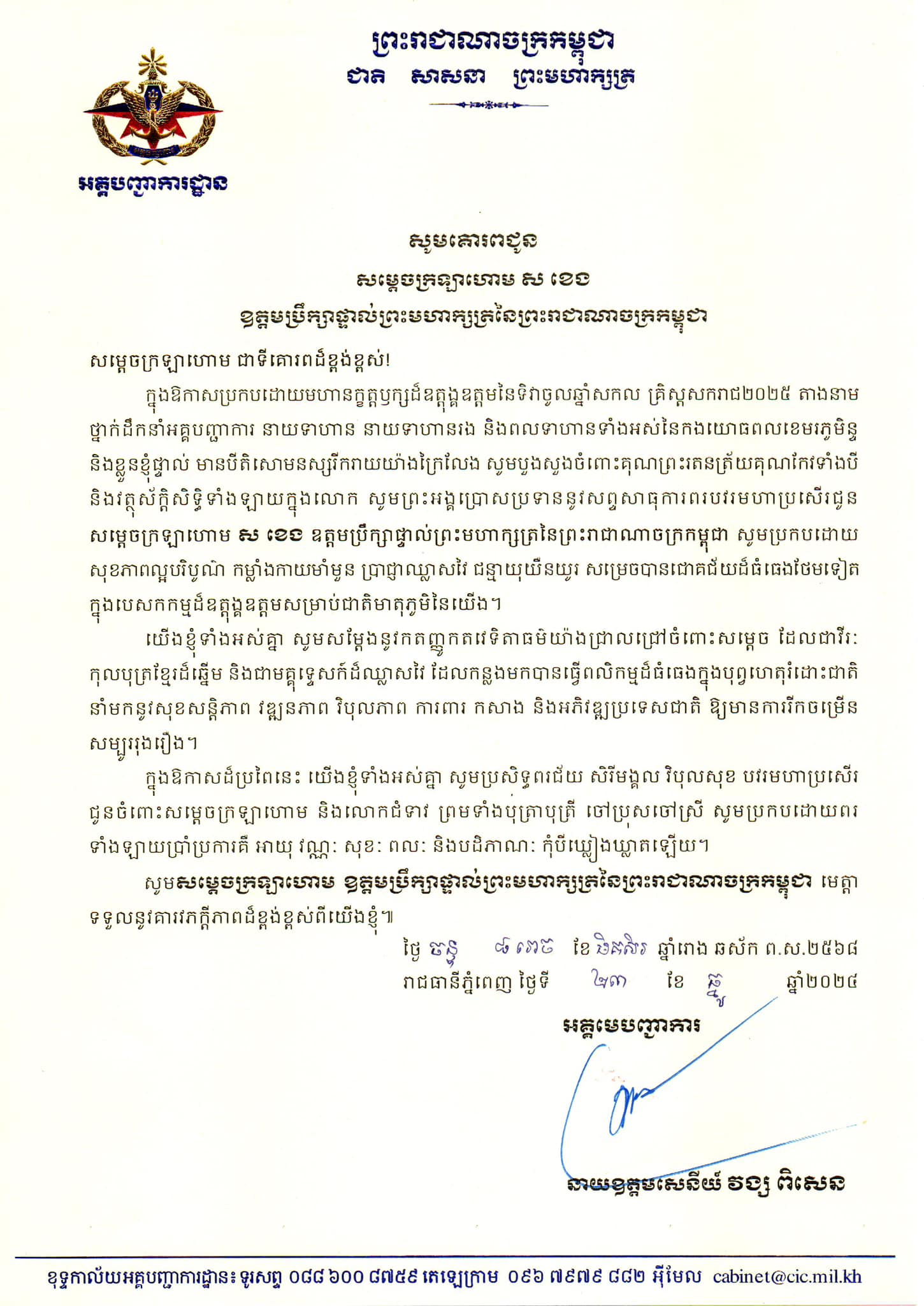 ក្នុងឱកាសដ៏មហោឡារិកនេះ យើងខ្ញុំទាំងអស់គ្នាសូមបួងសួងដល់គុណបុណ្យ ព្រះរតនត្រ័យកែវទាំងបី វត្ថុស័ក្ដិសិទ្ធិក្នុងលោក និងទេវតាឆ្នាំថ្មី សូមប្រោះព្រំសព្ទសាធុការពរ សិរីសួស្ដី ជ័យមង្គលវិបុលសុខ បវរមហាប្រសើរថ្លៃថ្លាជូនចំពោះ សម្ដេចក្រឡាហោម ស ខេង និងលោកជំទាវ សូមមានសុខភាពល្អបរិបូរណ៍ កម្លាំងពលំមាំមួន ប្រាជ្ញាភ្លឺថ្លា ជន្មាយុយឺនយូរ ឈ្នះអស់មារសត្រូវគ្រប់ទិសទី និងទទួលបានជោគជ័យថ្មីបន្ថែមទៀត ក្នុងបុព្វហេតុជាតិ មាតុភូមិ ប្រជាជនប្រកបដោយការអភិវឌ្ឍ និងរីកចម្រើនតរៀងទៅ។