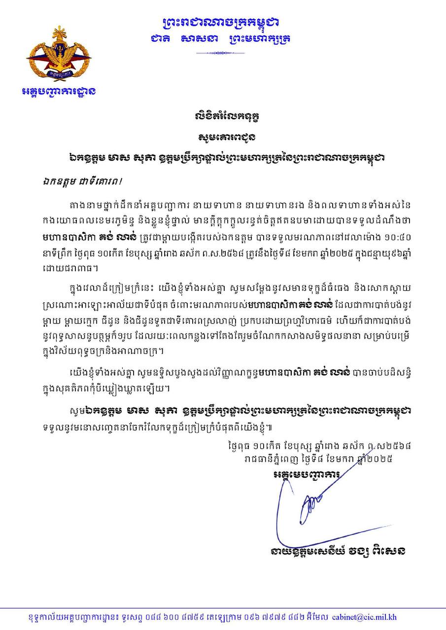 (ភ្នំពេញ)៖ ឯកឧត្ដម នាយឧត្ដមសេនីយ៍ វង្ស ពិសេន អគ្គមេបញ្ជាការ នៃកងយោធពលខេមរភូមិន្ទ ព្រមទាំងថ្នាក់ដឹកនាំ នាយទាហាន នាយទាហានរង និងពលទាហានទាំងអស់នៃកងយោធពលខេមរភូមិន្ទ ផ្ញើលិខិតរំលែកមរណទុក្ខចំពោះមរណភាព មហាឧបាសិកា គង់ លាន់ ត្រូវជាម្ដាយបង្កើតរបស់ឯកឧត្ដម មាស សុភា ឧត្ដមប្រឹក្សាផ្ទាល់ព្រះមហាក្សត្រនៃព្រះរាជាណាចក្រកម្ពុជា ដែលបានទទួលអនិច្ចកម្មនៅវេលាម៉ោង ១០:៤០នាទីព្រឹក ថ្ងៃពុធ ១០កើត ខែបុស្ស ឆ្នាំរោង ឆស័ក ព.ស.២៥៦៨ ត្រូវនឹងថ្ងៃទី៨ ខែមករា ឆ្នាំ២០២៥ ក្នុងជន្មាយុ ៩៦ឆ្នាំ ដោយជរាពាធ។