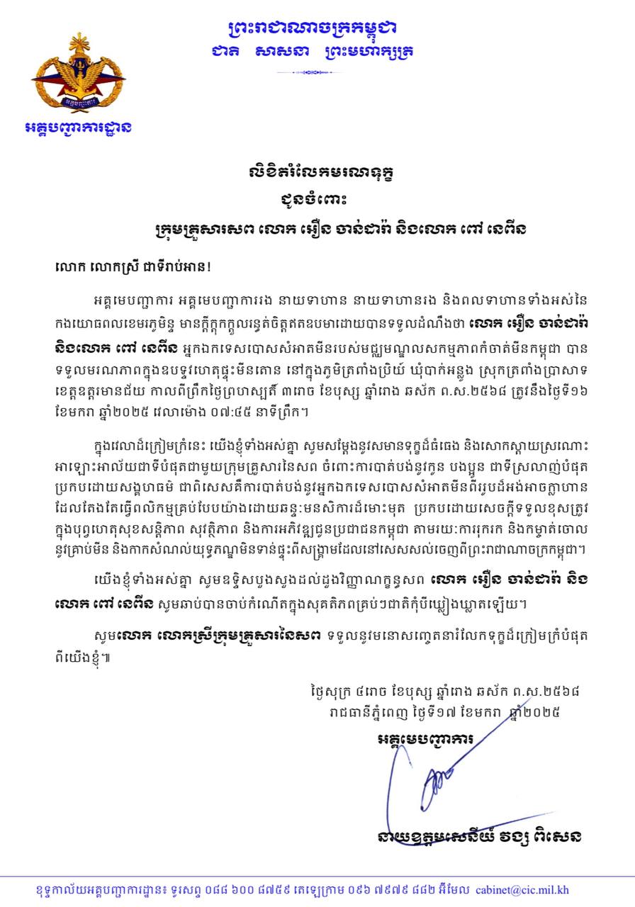 ក្នុងវេលាដ៏ក្រៀមក្រំនេះ ខ្ញុំនិងថ្នាក់ដឹកនាំព្រមទាំងនាយទាហាន នាយទាហាន និងពលទាហានទាំងអស់ សូមឧទ្ទិសបួងសួងដល់ដួងវិញ្ញាណក្ខន្ធ របស់ លោក អឿន ចាន់ដារ៉ា និង លោក ពៅ នេពីន បានឆាប់ចាប់បដិសន្ធិក្នុងសុគតិភពកុំបីឃ្លៀងឃ្លាតឡើយ៕