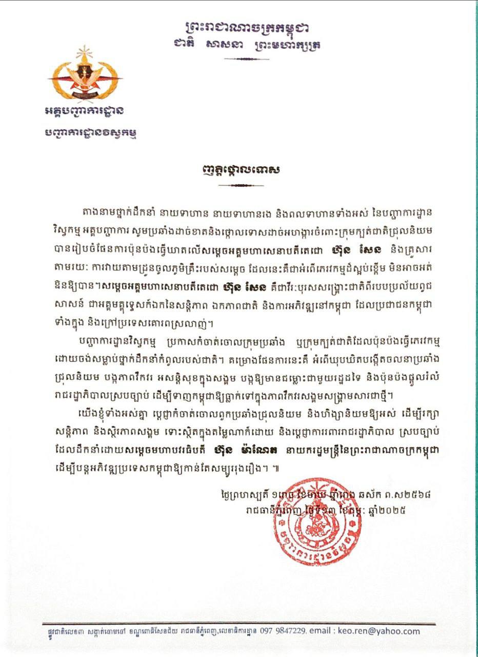 (ភ្នំពេញ)៖ ឯកឧត្តម នាយឧត្តមសេនីយ៍ ខ្វាន់ ស៊ាម អគ្គមេបញ្ជាការរងនៃកងយោធពលខេមរភូមិន្ទ មេបញ្ជាការ បញ្ជាការដ្ឋានវិស្វកម្ម ព្រមទាំងនាយទាហាន នាយទាហានរង និងពលទាហានទាំងអស់ បានចេញញត្តិថ្កោលទោសយ៉ាងដាច់អហង្ការ ចំពោះគម្រោងវាយប្រហារដោយដ្រូន ចូលភូមិគ្រឹះរបស់សម្តេចតេជោ ហ៊ុន សែន ប្រធានព្រឹទ្ធសភាកម្ពុជា។