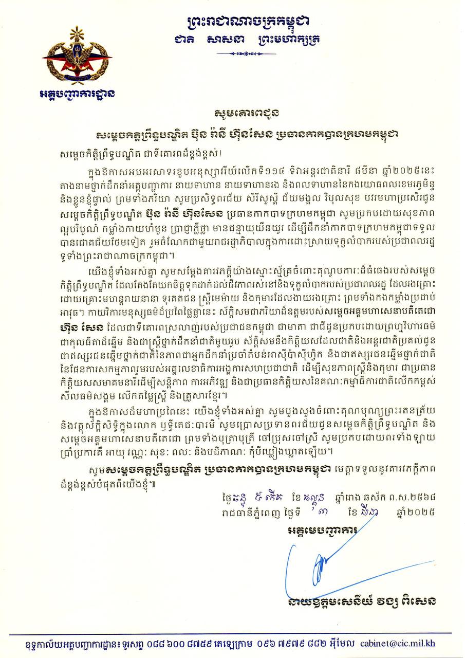 (ភ្នំពេញ)៖  ឯកឧត្តម នាយឧត្ដមសេនីយ៍ វង្ស ពិសេន អគ្គមេបញ្ជាការនៃកងយោធពលខេមរភូមិន្ទ ព្រមទាំងថ្នាក់ដឹកនាំ នាយទាហាន នាយទាហានរង និងពលទាហានទាំងអស់នៃកងយោធពលខេមរភូមិន្ទ  បានផ្ញើសារលិខិតគោរពជូនពរ សម្ដេចកិត្តិព្រឹទ្ធបណ្ឌិត ប៊ុន រ៉ានី ហ៊ុនសែន ប្រធានកាកបាទក្រហមកម្ពុជា ក្នុងឱកាសអបអរសាទរខួបអនុស្សាវរីយ៍លើកទី១១៤ ទិវាអន្តរជាតិនារី ៨មីនាឆ្នាំ២០២៥។