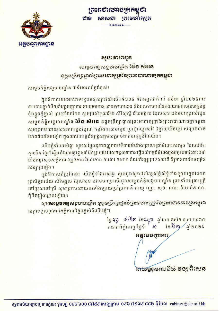 (ភ្នំពេញ)៖ ឯកឧត្តម នាយឧត្ដមសេនីយ៍ វង្ស ពិសេន អគ្គមេបញ្ជាការនៃកងយោធពលខេមរភូមិន្ទ ព្រមទាំងថ្នាក់ដឹកនាំ នាយទាហាន នាយទាហានរង និងពលទាហានទាំងអស់នៃកងយោធពលខេមរភូមិន្ទ បានផ្ញើសារលិខិតគោរពជូនពរ សម្ដេចកិត្តិសង្គហបណ្ឌិត ម៉ែន សំអន