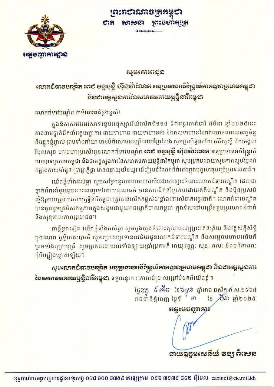(ភ្នំពេញ)៖ ឯកឧត្តម នាយឧត្ដមសេនីយ៍ វង្ស ពិសេន អគ្គមេបញ្ជាការនៃកងយោធពលខេមរភូមិន្ទ ព្រមទាំងថ្នាក់ដឹកនាំ នាយទាហាន នាយទាហានរង និងពលទាហានទាំងអស់នៃកងយោធពលខេមរភូមិន្ទ បានផ្ញើសារលិខិតគោរពជូនពរ លោកជំទាវបណ្ឌិត ពេជ ចន្ទមុន្នី ហ៊ុនម៉ាណែត អនុប្រធានអចិន្ត្រៃយ៍កាកបាទក្រហមកម្ពុជា និងជាអគ្គស្នងការនៃសមាគមកាយឬទ្ធិនារីកម្ពុជា ក្នុងឱកាសអបអរសាទរខួបអនុស្សាវរីយ៍លើកទី១១៤ ទិវាអន្តរជាតិនារី ៨មីនាឆ្នាំ២០២៥។