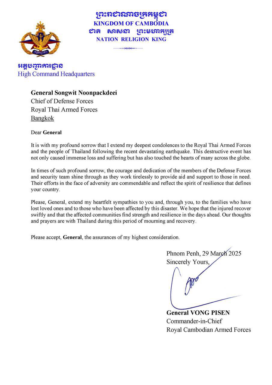 (ភ្នំពេញ)៖ នាយឧត្ដមសេនីយ៍ វង្ស ពិសេន អគ្គមេបញ្ជាការនៃកងយោធពលខេមរភូមិន្ទ ព្រមទាំងថ្នាក់ដឹកនាំ នាយទាហាន នាយទាហានរង និងពលទាហានទាំងអស់នៃកងយោធពលខេមរភូមិន្ទ នៅថ្ងៃទី២៩ ខែមីនា ឆ្នាំ២០២៥នេះ បានផ្ញើសារលិខិតជូននាយឧត្ដមសេនីយ៍ Songwit Noonpackdeei អគ្គមេបញ្ជាការ កងទ័ពភូមិន្ទថៃ ដោយចូលរួមរំលែកទុក្ខ និងសម្ដែងការសោកស្ដាយចំពោះសោកនាដកម្មនៃគ្រោះរញ្ជួយដីនៅទីក្រុងបាងកក។