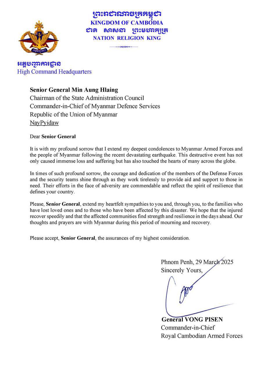 (ភ្នំពេញ)៖ នាយឧត្ដមសេនីយ៍ វង្ស ពិសេន អគ្គមេបញ្ជាការនៃកងយោធពលខេមរភូមិន្ទ ព្រមទាំងថ្នាក់ដឹកនាំ នាយទាហាន នាយទាហានរង និងពលទាហានទាំងអស់នៃកងយោធពលខេមរភូមិន្ទ នៅថ្ងៃទី២៩ ខែមីនា ឆ្នាំ២០២៥នេះ បានផ្ញើសារលិខិតជូនឯកឧត្តម នាយឧត្តមសេនីយ៍ផុតលេខ មីន អ៊ុង លាំង ប្រធានក្រុមប្រឹក្សារដ្ឋបាលរដ្ឋ និងជាអគ្គមេបញ្ជាការកងទ័ពមីយ៉ាន់ម៉ា ដោយចូលរួមរំលែកទុក្ខ និងសម្ដែងការសោកស្ដាយចំពោះសោកនាដកម្មនៃគ្រោះរញ្ជួយដីនៅប្រទេសមីយ៉ាន់ម៉ា។