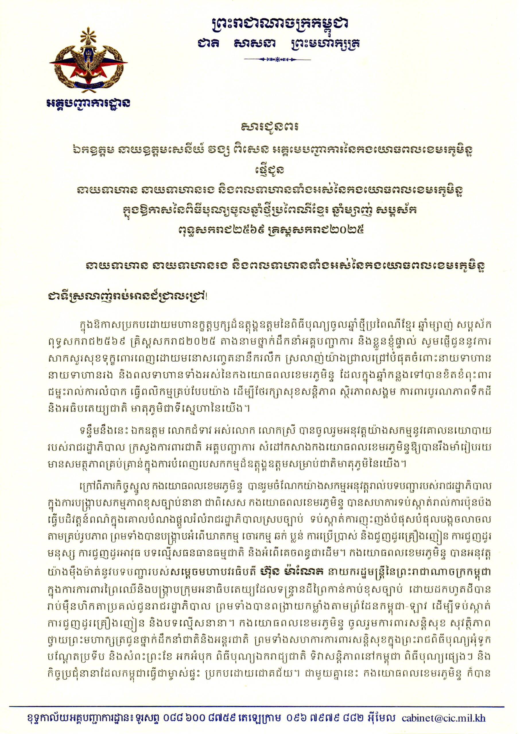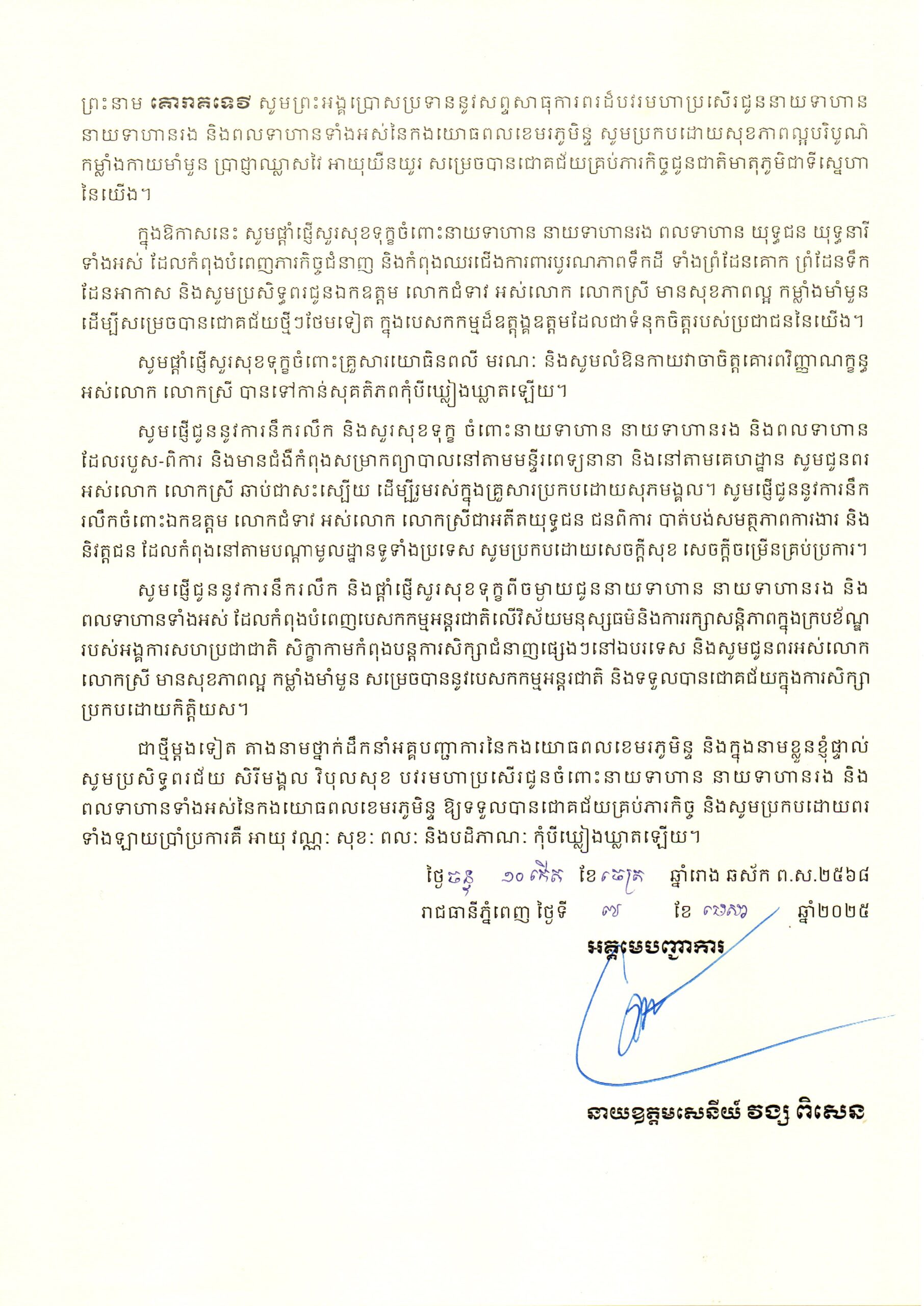 (ភ្នំពេញ)៖ ឯកឧត្ដម នាយឧត្តមសេនីយ៍ វង្ស ពិសេន អគ្គមេបញ្ជាការនៃកងយោធពលខេមរភូមិន្ទ ផ្ញើជូននាយទាហាន នាយទាហានរង និងពលទាហានទាំងអស់នៃកងយោធពលខេមរភូមិន្ទ ក្នុងឱកាសនៃពិធីបុណ្យចូលឆ្នាំថ្មីប្រពៃណីជាតិខ្មែរ ឆ្នាំម្សាញ់ សប្តស័ក ព.ស ២៥៦៩ គ.ស ២០២៥។