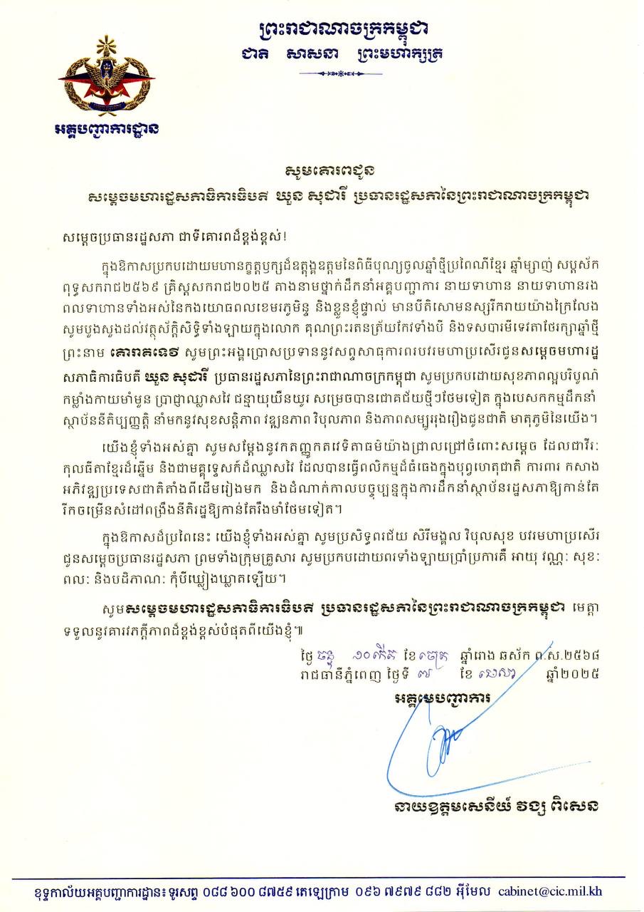 (ភ្នំពេញ)៖ ឯកឧត្ដម នាយឧត្តមសេនីយ៍ វង្ស ពិសេន អគ្គមេបញ្ជាការ កងយោធពលខេមរភូមិន្ទ ព្រមទាំងនាយទាហាន នាយទាហានរង និងពលទាហានទាំងអស់នៃកងយោធពលខេមរភូមិន្ទ សូមផ្ញើសារលិខិតគោរពជូនពរ សម្តេចមហារដ្ឋសភាធិការធិបតី ឃួន សុដារី ប្រធានរដ្ឋសភានៃព្រះរាជាណាចក្រកម្ពុជាក្នុងឱកាសពិធីបុណ្យចូលឆ្នាំថ្មី ប្រពៃណីជាតិខ្មែរ ឆ្នាំម្សាញ់ សប្ដស័ក។