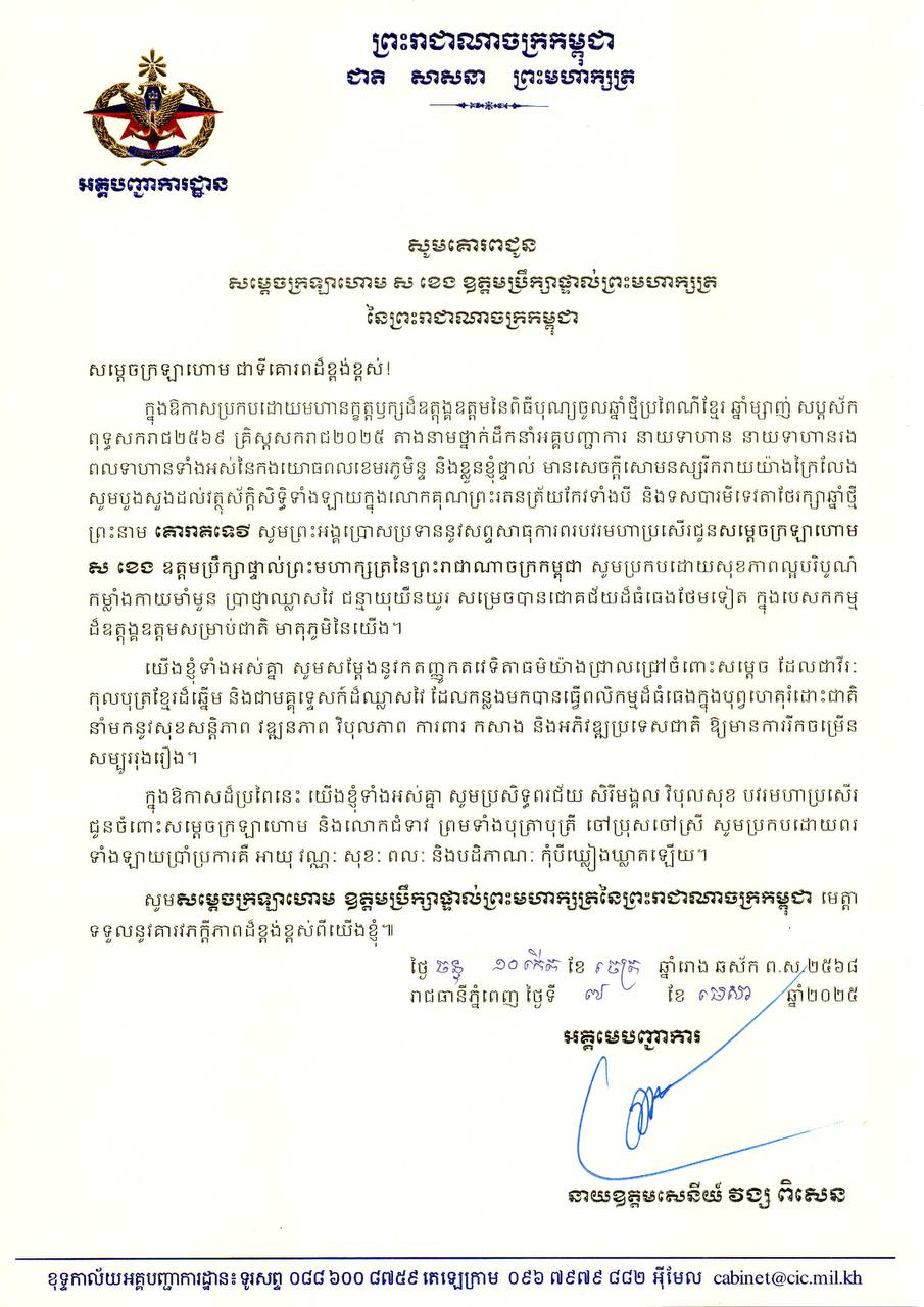 (ភ្នំពេញ)៖ ឯកឧត្ដម នាយឧត្តមសេនីយ៍ វង្ស ពិសេន អគ្គមេបញ្ជាការ កងយោធពលខេមរភូមិន្ទ ព្រមទាំងនាយទាហាន នាយទាហានរង និងពលទាហានទាំងអស់ នៃកងយោធពលខេមរភូមិន្ទ សូមផ្ញើសារលិខិតគោរពជូនពរសម្ដេចក្រឡាហោម ស ខេង ឧត្ដមប្រឹក្សាផ្ទាល់ព្រះមហាក្សត្រនៃព្រះរាជាណាចក្រកម្ពុជា ក្នុងឱកាសពិធីបុណ្យចូលឆ្នាំថ្មី ប្រពៃណីជាតិខ្មែរ ឆ្នាំម្សាញ់ សប្ដស័ក។