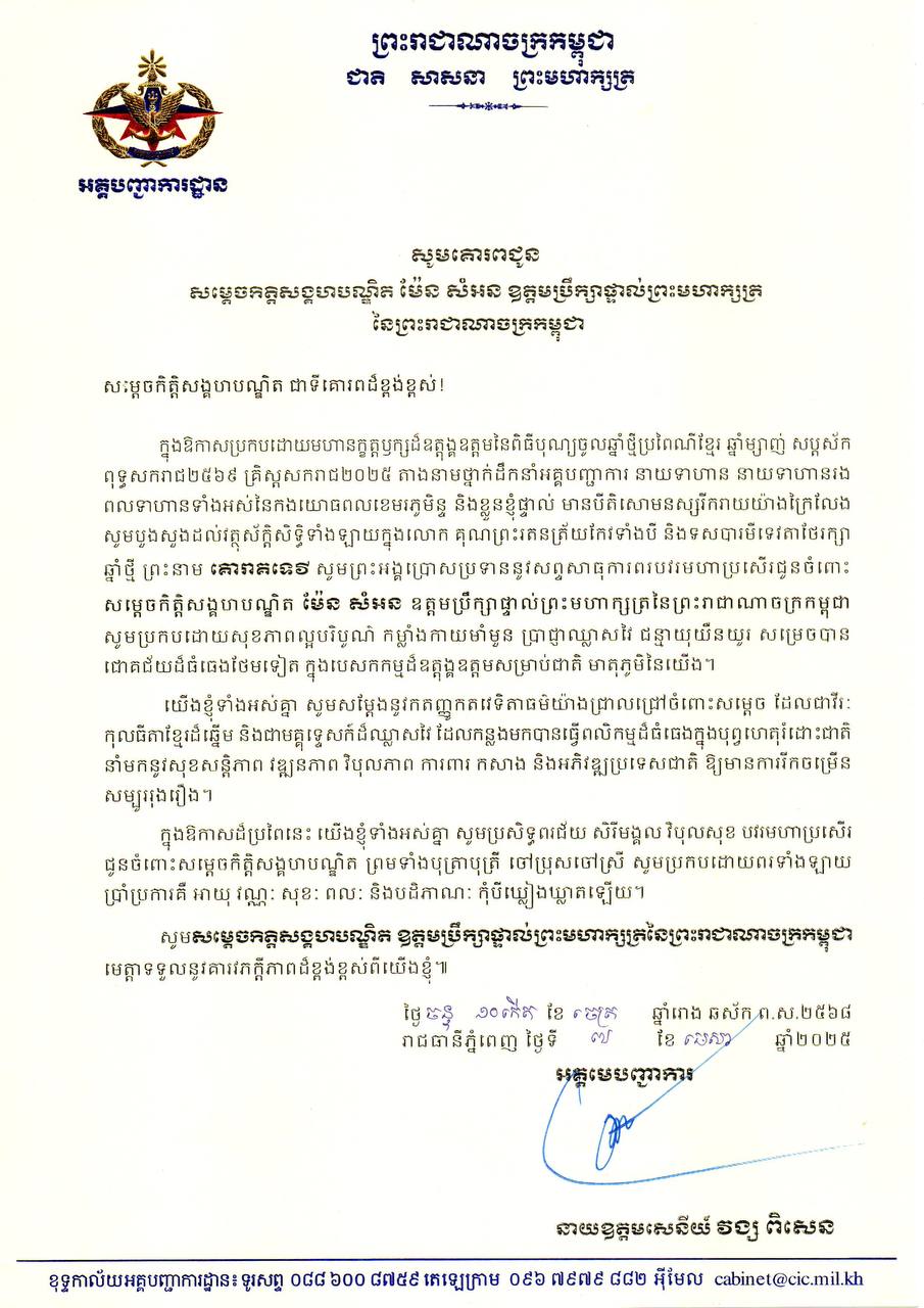 (ភ្នំពេញ)៖ ឯកឧត្ដម នាយឧត្តមសេនីយ៍ វង្ស ពិសេន អគ្គមេបញ្ជាការ កងយោធពលខេមរភូមិន្ទ ព្រមទាំងនាយទាហាន នាយទាហានរង និងពលទាហានទាំងអស់ នៃកងយោធពលខេមរភូមិន្ទ សូមផ្ញើសារលិខិតគោរពជូនពរសម្ដេចកិត្តិសង្គហបណ្ឌិត ម៉ែន សំអន ឧត្ដមប្រឹក្សាផ្ទាល់ព្រះមហាក្សត្រនៃព្រះរាជាណាចក្រកម្ពុជា ក្នុងឱកាសពិធីបុណ្យចូលឆ្នាំថ្មី ប្រពៃណីជាតិខ្មែរ ឆ្នាំម្សាញ់ សប្ដស័ក។