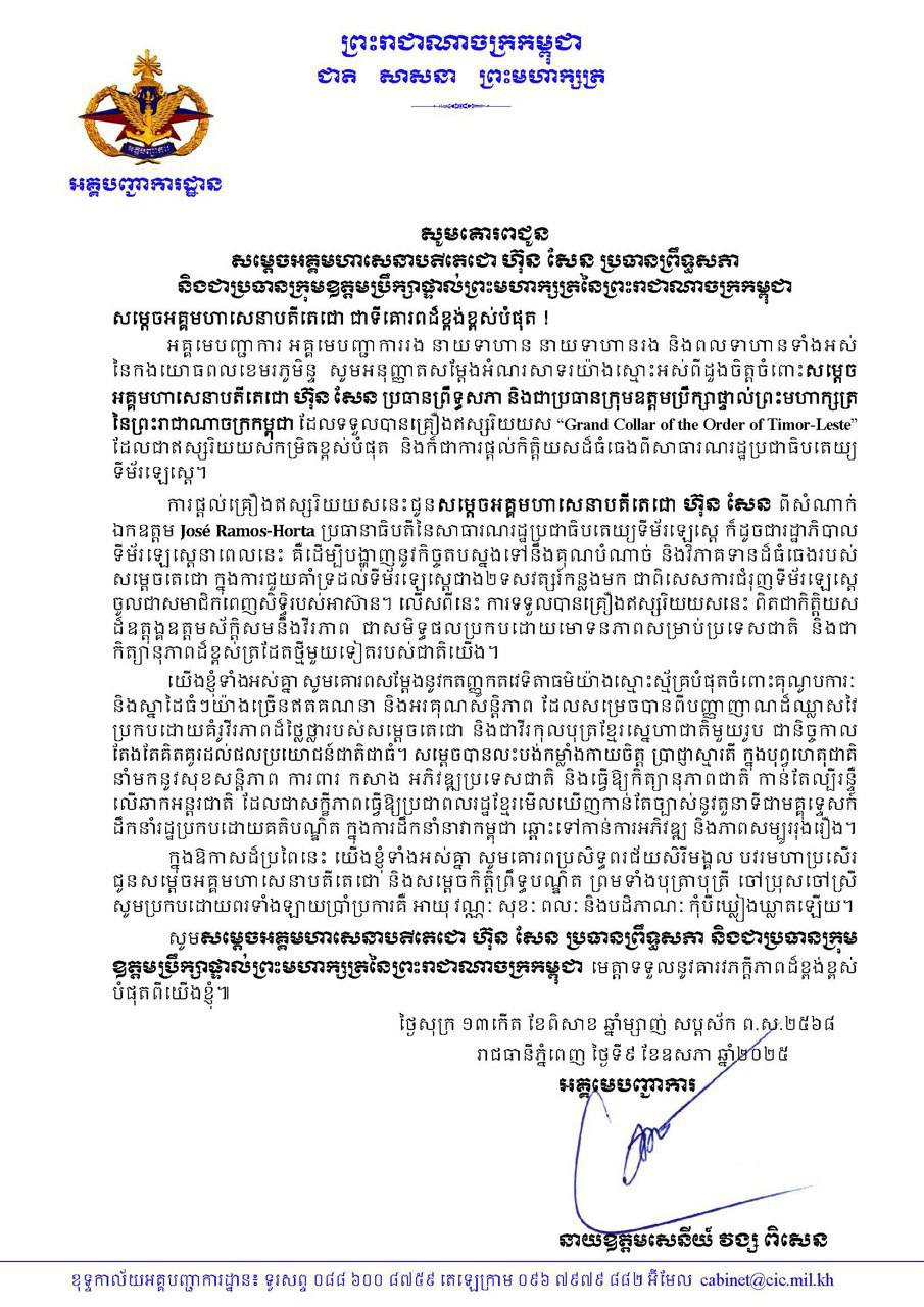 (ភ្នំពេញ)៖ ឯកឧត្ដម នាយឧត្តមសេនីយ៍ វង្ស ពិសេន អគ្គមេបញ្ជាការ កងយោធពលខេមរភូមិន្ទ ព្រមទាំងថ្នាក់ដឹកនាំ នាយទាហាន នាយទាហានរង និងពលទាហានទាំងអស់នៃកងយោធពលខេមរភូមិន្ទ សូមគោរពអបអរសាទរយ៉ាងស្មោះអស់ពីដួងចិត្តជូនចំពោះ សម្តេចតេជោ ហ៊ុន សែន ប្រធានព្រឹទ្ធសភាកម្ពុជា ក្នុងឱកាសទទួលបានគ្រឿងឥស្សរិយយស «Grand Collar of the Order of Timor-Leste» ជាឥស្សរិយយសកម្រិតខ្ពស់បំផុតរបស់ប្រទេសទីម័រឡេស្តេ។