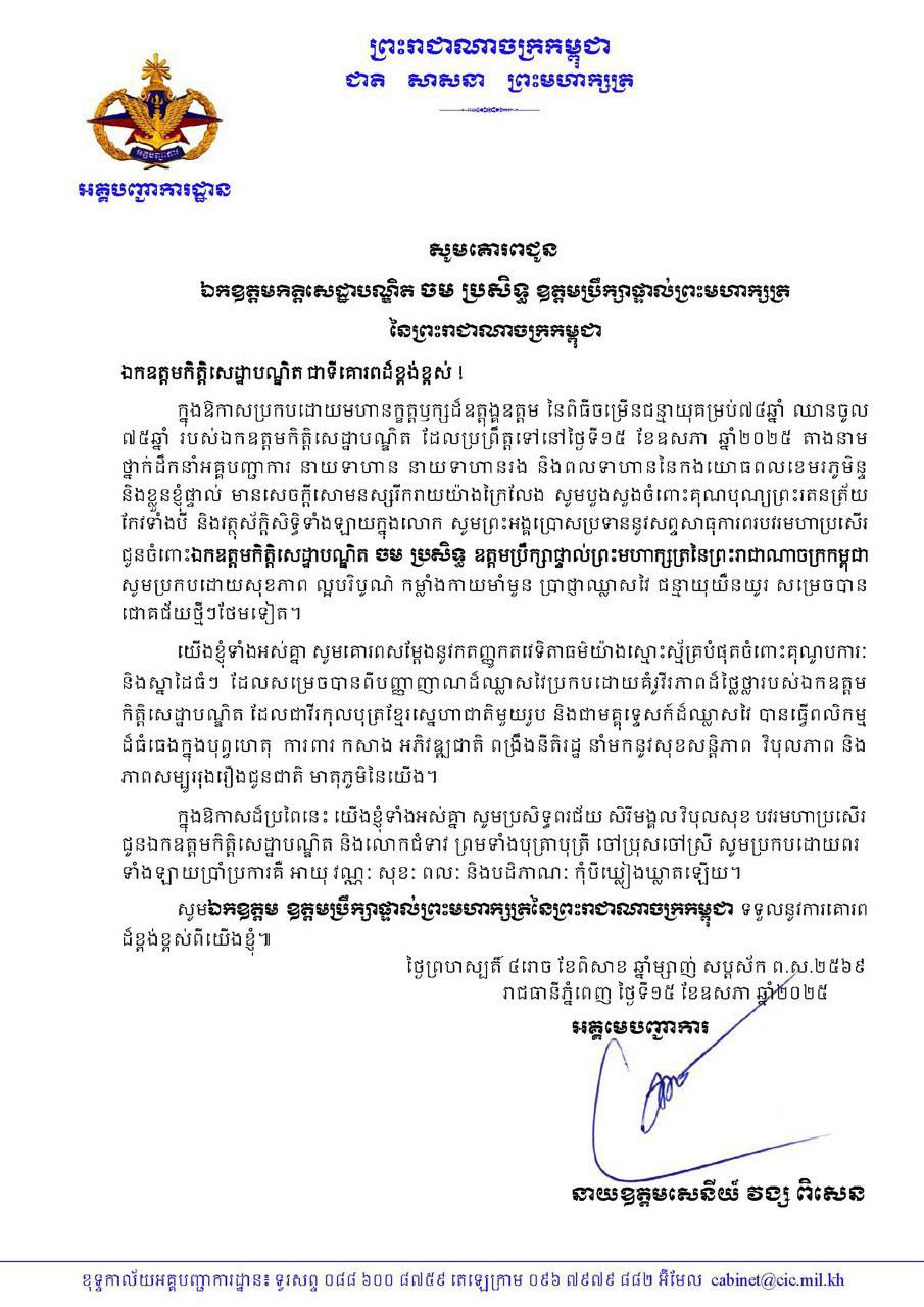នៃព្រះរាជាណាចក្រកម្ពុជា ក្នុងឱកាសប្រកបដោយជ័យមង្គលនៃពិធីចម្រើនជន្មាយុគម្រប់៧៤ឆ្នាំ ឈានចូល ៧៥ឆ្នាំ នៅថ្ងៃទី១៥ ខែឧសភា ឆ្នាំ២០២៥។