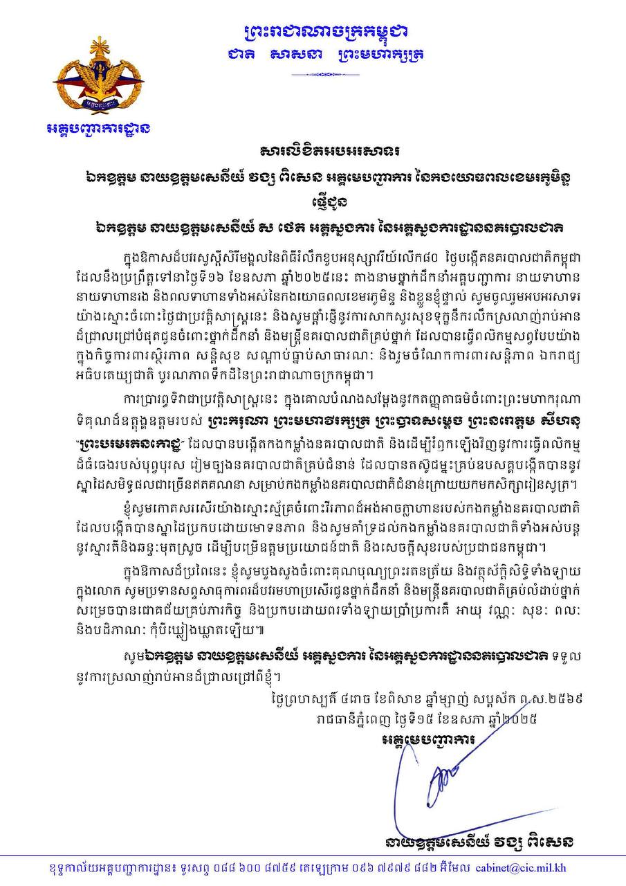 (ភ្នំពេញ)៖ ក្នុងឱកាសដ៏បវរសួស្តីសិរីមង្គលនៃពិធីរំលឹកខួបអនុស្សាវរីយ៍លើក៨០ ថ្ងៃបង្កើតនគរបាលជាតិកម្ពុជា នាថ្ងៃទី១៦ ខែឧសភា ឆ្នាំ២០២៥នេះ ឯកឧត្ដម នាយឧត្ដមសេនីយ៍ វង្ស ពិសេន អគ្គមេបញ្ជាការនៃកងយោធពលខេមរភូមិន្ទ ព្រមទាំងថ្នាក់ដឹកនាំ នាយទាហាន នាយទាហានរង និងពលទាហានទាំងអស់នៃកងយោធពលខេមរភូមិន្ទ សូមចូលរួមអបអរសាទរយ៉ាងស្មោះចំពោះថ្ងៃជាប្រវត្តិសាស្រ្តនេះ និងសូមផ្តាំផ្ញើនូវការសាកសួរសុខទុក្ខនឹករលឹកស្រលាញ់រាប់អានដ៏ជ្រាលជ្រៅបំផុតជូនចំពោះថ្នាក់ដឹកនាំ និងមន្ត្រីនគរបាលជាតិគ្រប់ថ្នាក់ ដែលបានធ្វើពលិកម្មសព្វបែបយ៉ាង ក្នុងកិច្ចការពារស្ថិរភាព សន្តិសុខ សណ្ដាប់ធ្នាប់សាធារណៈ និងរួមចំណែកការពារសន្តិភាព ឯករាជ្យ អធិបតេយ្យជាតិ បូរណភាពទឹកដីនៃព្រះរាជាណាចក្រកម្ពុជា។