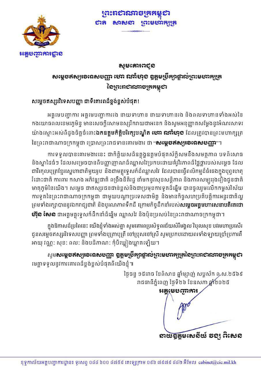 ការទទួលបានគោរមងារនេះ ជាកិត្តិយសដ៏ឧត្តុង្គឧត្តមបំផុតស័ក្តិសមនឹងសមត្ថភាព បទពិសោធ និងស្នាដៃធំៗ ដែលសម្រេចបានពីបញ្ញាញាណដ៏ឈ្លាសវៃ ប្រកបដោយគំរូវីរភាពដ៏ថ្លៃថ្លា របស់សម្ដេច ដែលជាវីរកុលបុត្រខ្មែរស្នេហាជាតិមួយរូប និងជាមគ្គុទ្ទេសក៍ដ៏ឈ្លាសវៃ ដែលបានធ្វើពលិកម្មដ៏ធំធេង ក្នុងបុព្វហេតុរំដោះជាតិ ការពារ កសាង អភិវឌ្ឍជាតិ ពង្រឹងនីតិរដ្ឋ នាំមកនូវសុខសន្តិភាព និងភាពសម្បូររុងរឿងជូនជាតិ មាតុភូមិនៃយើង។ សម្តេច ជាឥស្សរជនជាន់ខ្ពស់និងជាប្រមុខការទូតដ៏ឆ្នើម បានចូលរួមលើកកម្ពស់វិស័យការទូតនៃព្រះរាជាណាចក្រកម្ពុជា ជាមួយបណ្ដាប្រទេសជាមិត្ត និងមានកិច្ចសហប្រតិបត្តិការអន្តរជាតិល្អ ព្រមទាំងរក្សាបាននូវឯករាជ្យជាតិ និងបូរណភាពទឹកដីក្រោមកិច្ចដឹកនាំរបស់សម្ដេចអគ្គមហាសេនាបតីតេជោ ហ៊ុន សែន ជាអគ្គមគ្គុទ្ទេសក៏ដឹកនាំដ៏ឆ្នើម ឈ្លាសវៃ និងប៉ិនប្រសប់នៃព្រះរាជាណាចក្រកម្ពុជា។