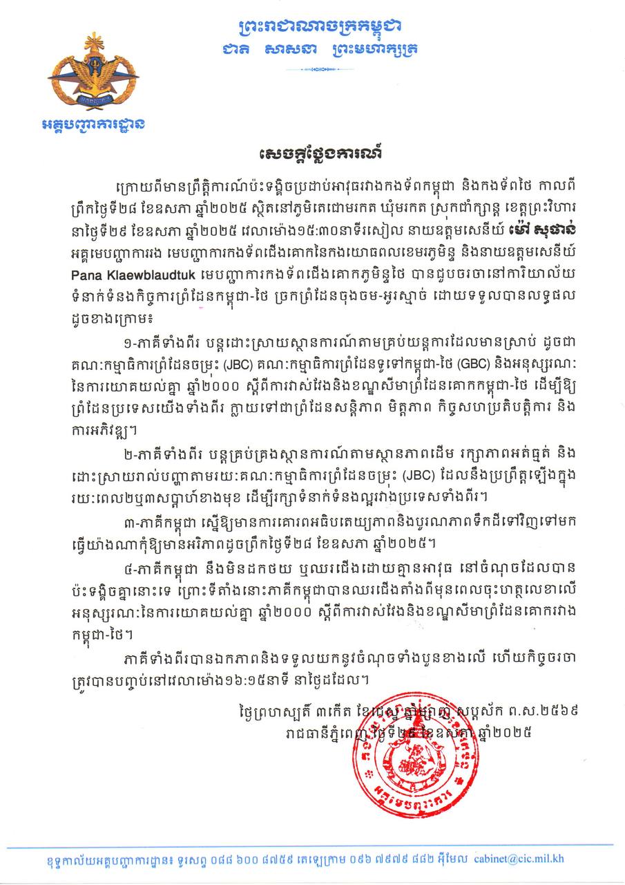 (ភ្នំពេញ)៖ អគ្គបញ្ជាការដ្ឋានកងយោធពលខេមរភូមិន្ទ បានចេញសេចក្តីថ្លែងការណ៍ជុំវិញជំនួបចរចារវាងកម្ពុជា-ថៃ ពាក់ព័ន្ធព្រឹត្តិការណ៍ប៉ះទង្គិចប្រដាប់អាវុធរវាងកងទ័ពប្រទេសទាំង២ ដែលបានធ្វើឡើងនារសៀលថ្ងៃទី២៩ ខែឧសភា ឆ្នាំ២០២៥នេះរវាងនាយឧត្តមសេនីយ៍ ម៉ៅ សុផាន់ អគ្គមេបញ្ជាការរង មេបញ្ជាការកងទ័ពជើងគោកនៃកងយោធពលខេមរភូមិន្ទ និងនាយឧត្តមសេនីយ៍ Pana Klaewblaudtuk មេបញ្ជាការកងទ័ពជើងគោកភូមិន្ទថៃ បានជួបចរចានៅការិយាល័យ ទំនាក់ទំនងកិច្ចការព្រំដែនកម្ពុជា-ថៃ ច្រកព្រំដែនចុងចម-អូរស្មាច់។