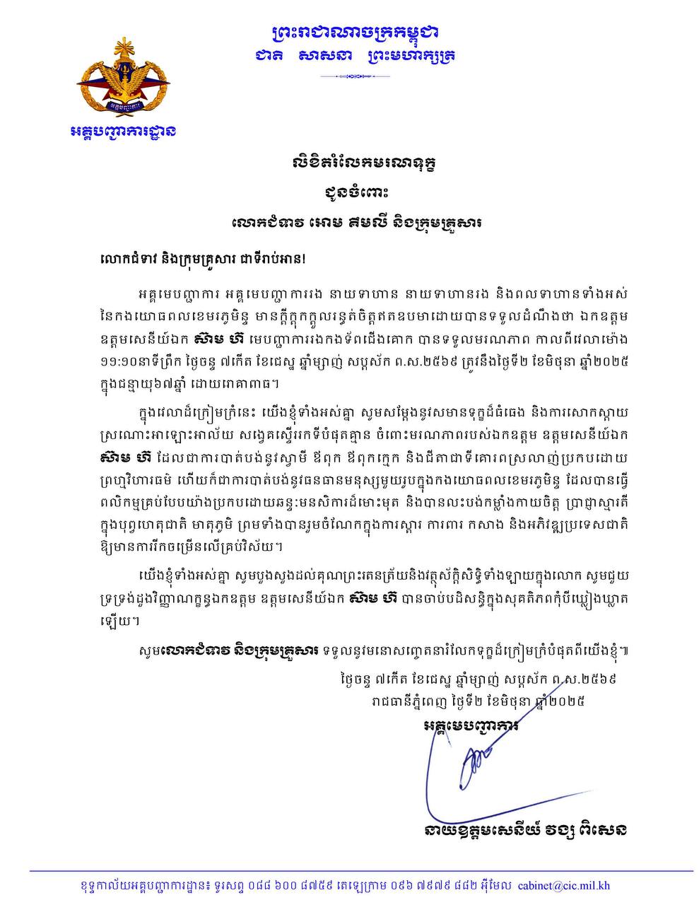 ឯកឧត្ដម នាយឧត្ដមសេនីយ៍ វង្ស ពិសេន ផ្ញើលិខិតរំលែកទុក្ខជូនលោកជំទាវ អោម គឹមលី និងក្រុមគ្រួសារ ចំពោះមរណភាព ឯកឧត្ដម ឧត្ដមសេនីយ៍ឯក ស៊ាម ហ៊