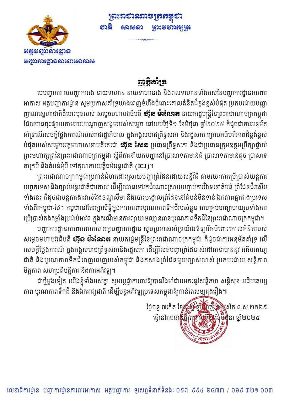 យើងខ្ញុំទាំងអស់គ្នា សូមគាំទ្រផងដែរនូវប្រសាសន៍ដ៏ថ្លៃថ្លារបស់សម្តេចអគ្គមហាសេនាបតីតេជោ ហ៊ុន សែន ដែលគាំទ្រឲ្យរាជរដ្ឋាភិបាលប្រទេសទាំងពីរ នាំយកបញ្ហាព្រំដែនទៅដោះស្រាយនៅតុលាការអន្តរជាតិ ដោយមិនចាំបាច់ឲ្យកម្ពុជាប្តឹង។ នេះគឺជាចំណាត់ការប្រកបដោយភាពចាស់ទុំខាងនយោបាយ នៃអ្នកដឹកនាំកម្ពុជា ដោយបានគិតគូរវែងឆ្ងាយ និងរក្សានូវភាពអត់ធ្មត់ខ្ពស់។