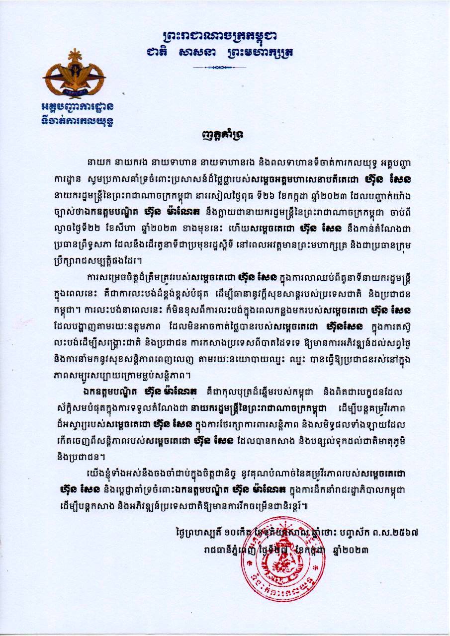យើងខ្ញុំទាំងអស់គ្នា សូមប្រកាសគាំទ្រទាំងស្រុងចំពោះការសម្រេចចិត្តដ៏ត្រឹមត្រូវរបស់សម្តេចតេជោ ហ៊ុន សែន និងសូមប្រកាសគាំទ្រទាំងស្រុងចំពោះឯកឧត្តមបណ្ឌិត ហ៊ុន ម៉ាណែត សម្រាប់កាន់តួនាទីជានាយករដ្ឋមន្រ្តីថ្មី សម្រាប់អាណត្តិទី៧នេះ ដើម្បីបន្តដឹកនាំប្រទេសកម្ពុជា ពង្រឹងសុខសន្តិភាពកាន់តែរឹងមាំ, ប្រទេសជាតិកាន់តែមានការអភិវឌ្ឍរីកចម្រើន និងមានមោទនភាព ហើយប្រជាជនកាន់តែមានជីវភាពធូរធា និងរស់នៅប្រកបដោយសេចក្តីសុខសាន្តបន្តទៀត។
