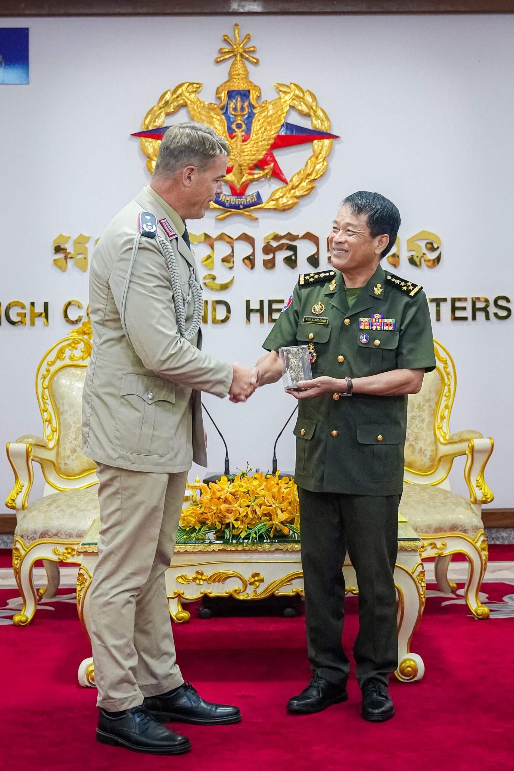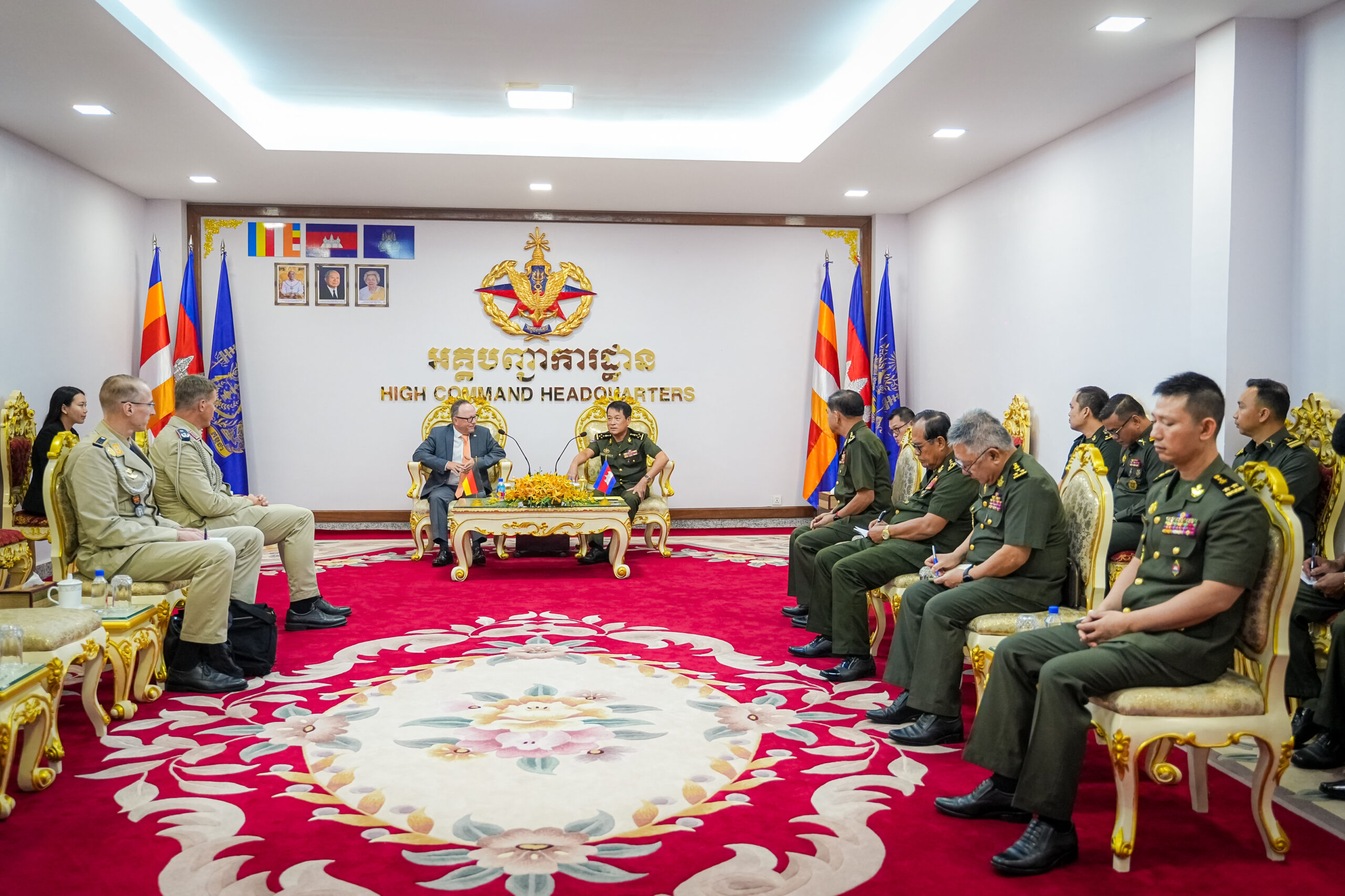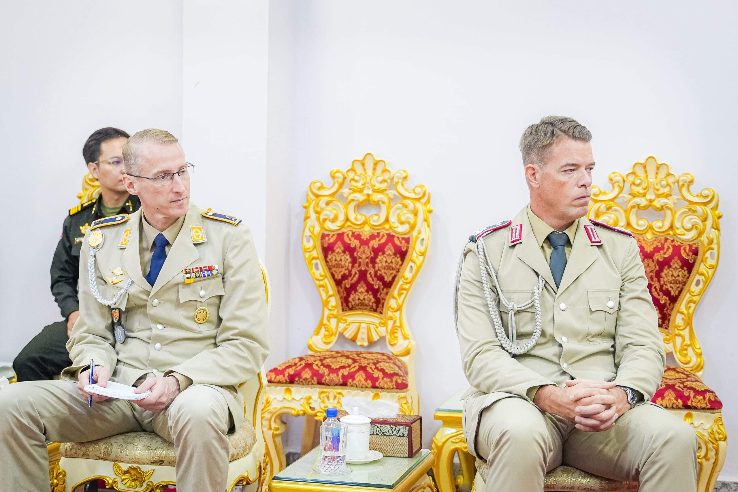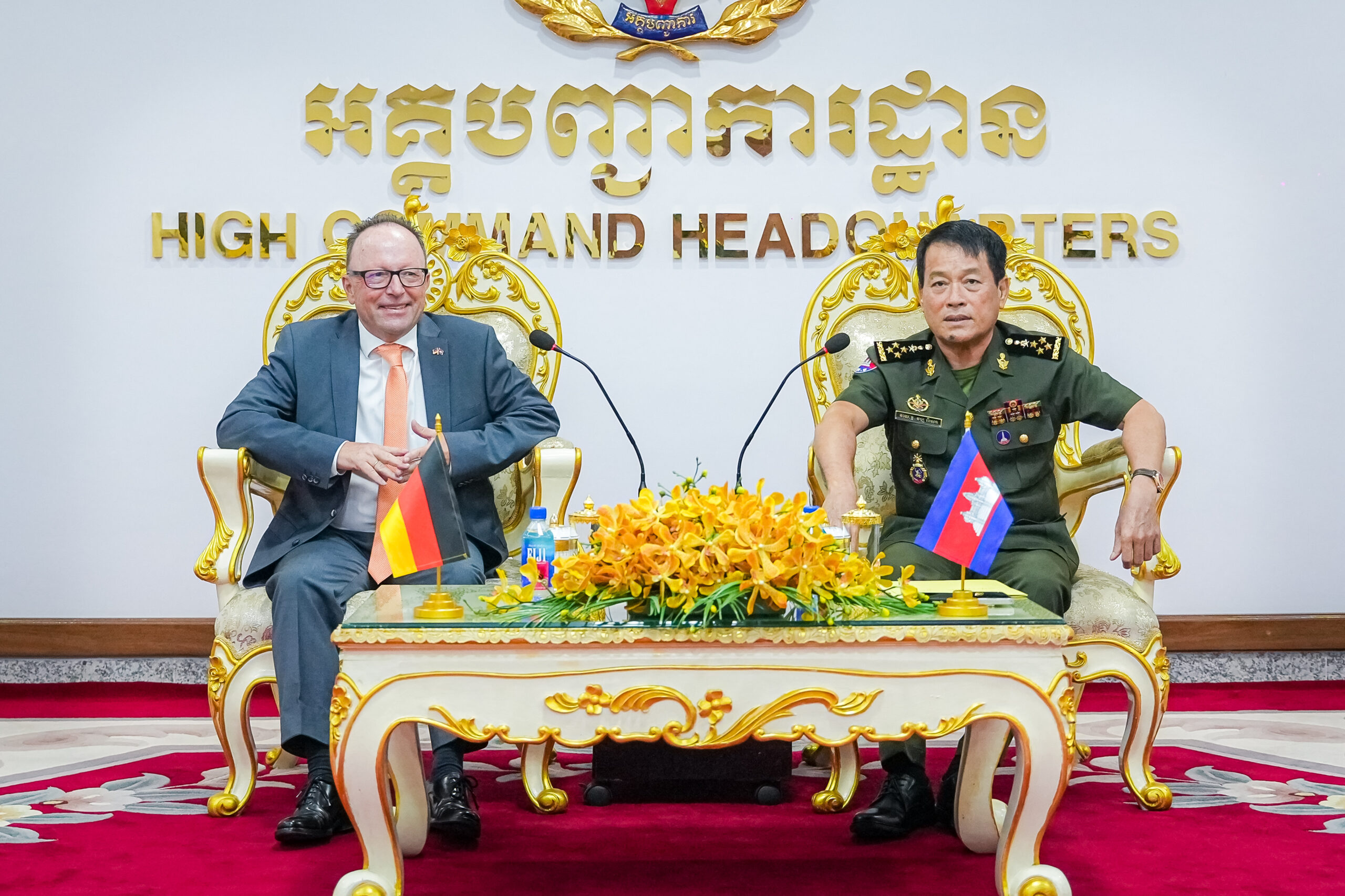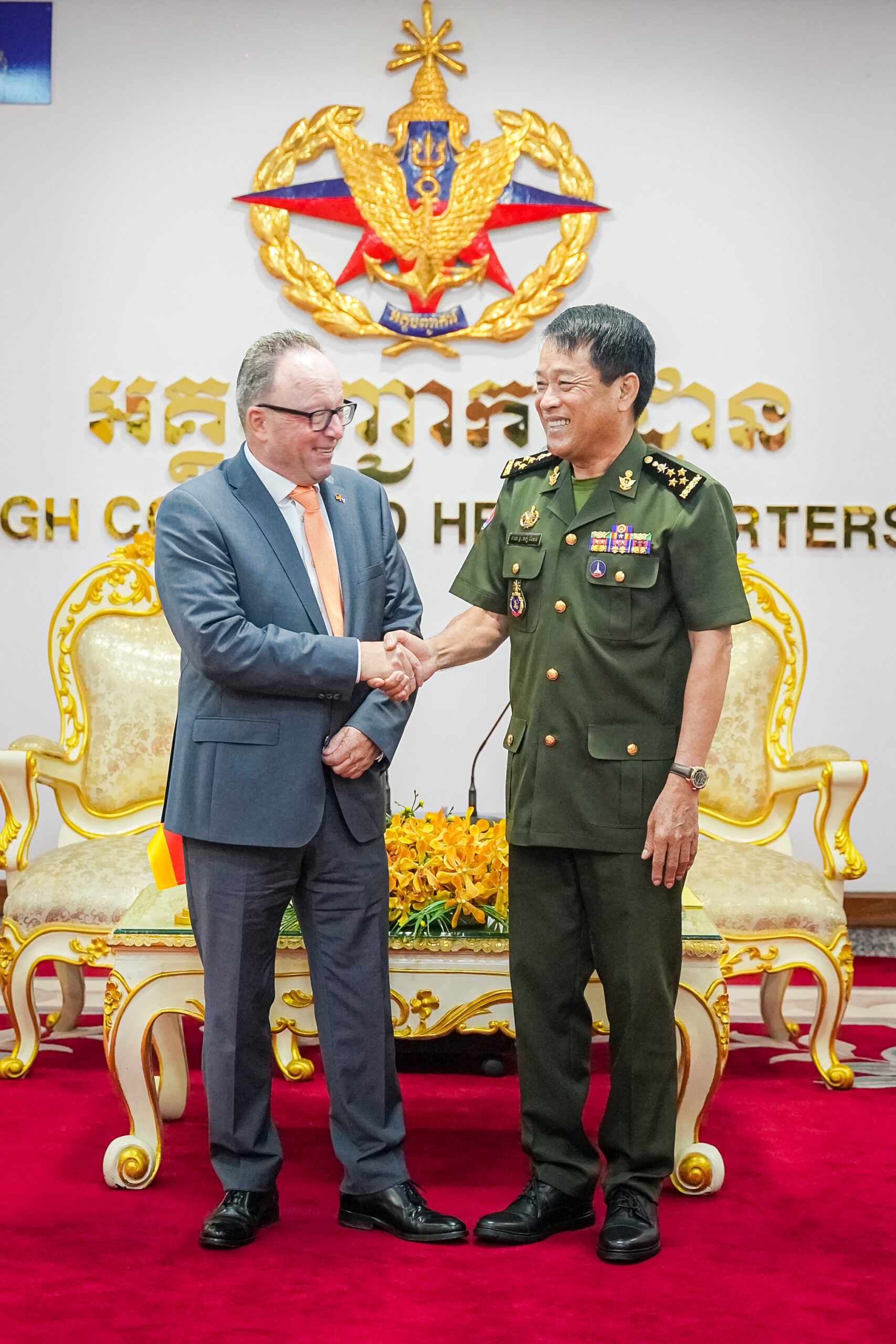 (ភ្នំពេញ)៖ នៅព្រឹកថ្ងៃទី១៧ ខែកក្កដា ឆ្នាំ២០២៥ ឯកឧត្តម នាយឧត្តមសេនីយ៍ វង្ស ពិសេន អគ្គមេបញ្ជាការ នៃកងយោធពលខេមរភូមិន្ទ បានអនុញ្ញាតឱ្យ ឯកឧត្តម Stefan Messerer ឯកអគ្គរដ្ឋទូតអាល្លឺម៉ង់ប្រចាំកម្ពុជា និងលោក វរសេនីយ៍ទោ Mark Steffen Gottschalk នាយការិយាល័យអនុព័ន្ធយោធាអាល្លឺម៉ង់ប្រចាំកម្ពុជា ដែលមាននិវេសនដ្ឋាននៅទីក្រុងហាណូយ ប្រទេសវៀតណាម ចូលជួបសម្តែងការគួរសម នៅអគ្គបញ្ជាការដ្ឋាន។