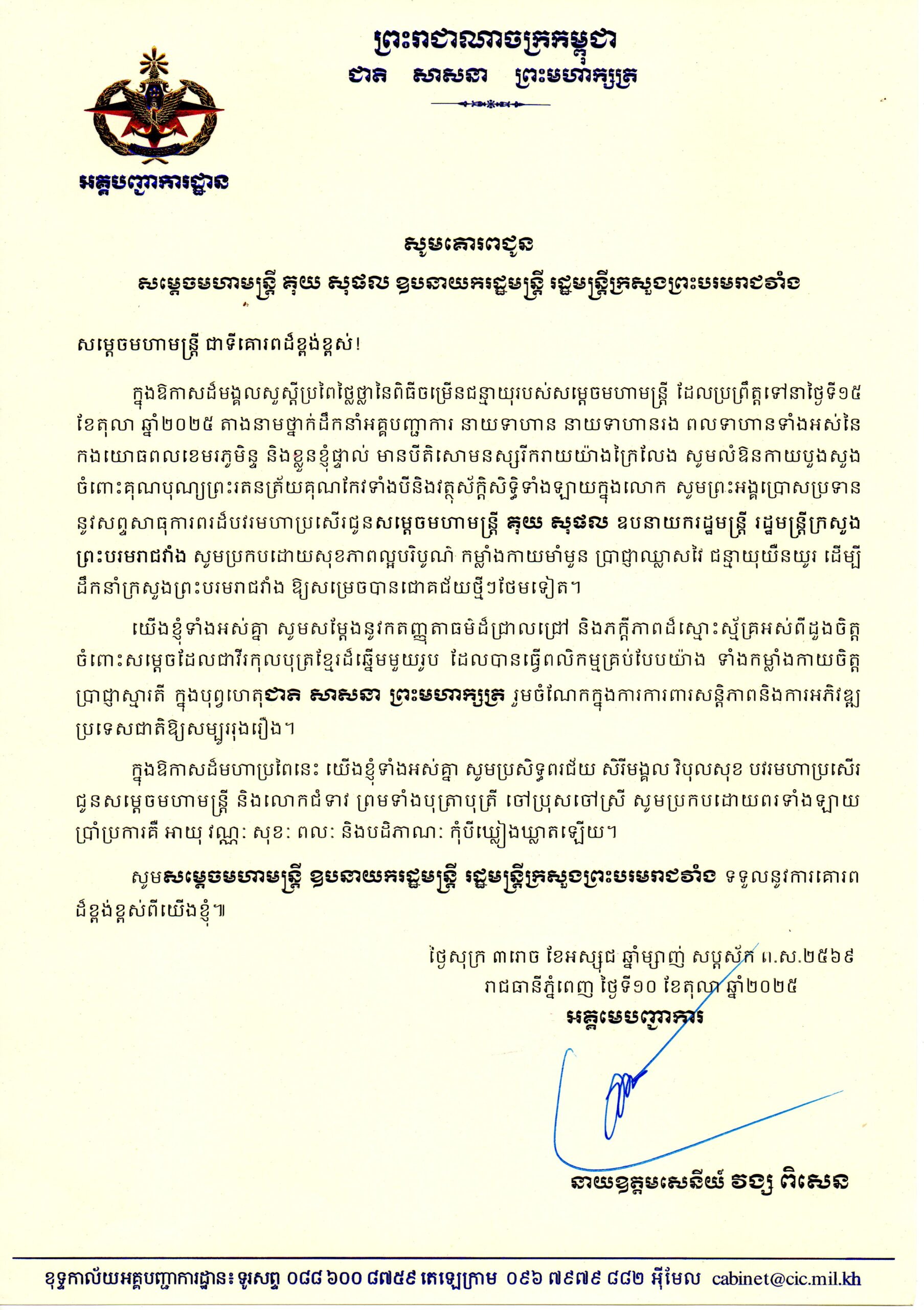 (ភ្នំពេញ)៖ ក្នុងឱកាសដ៏វិសេសវិសាលប្រកបដោយសិរីមង្គលដ៏បវរ នៃពិធីចម្រើនជន្មាយុរបស់ សម្តេចមហាមន្ត្រី គុយ សុផល ឧត្តមប្រឹក្សាផ្ទាល់ព្រះមហាក្សត្រ និងជាឧបនាយករដ្ឋមន្ត្រី រដ្ឋមន្ត្រីក្រសួងព្រះបរមរាជវាំង នៃព្រះរាណាចក្រកម្ពុជា នៅថ្ងៃទី១៥ ខែតុលា ឆ្នាំ២០២៥ ឯកឧត្ដម នាយឧត្ដមសេនីយ៍ វង្ស ពិសេន អគ្គមេបញ្ជាការនៃកងយោធពលខេមរភូមិន្ទ សូមចូលរួមសម្ដែងនូវក្តីសោមនស្សក្រៃលែងប្រកបដោយភាពកក់ក្តៅ ជូនចំពោះ សម្តេចមហាមន្ត្រី។