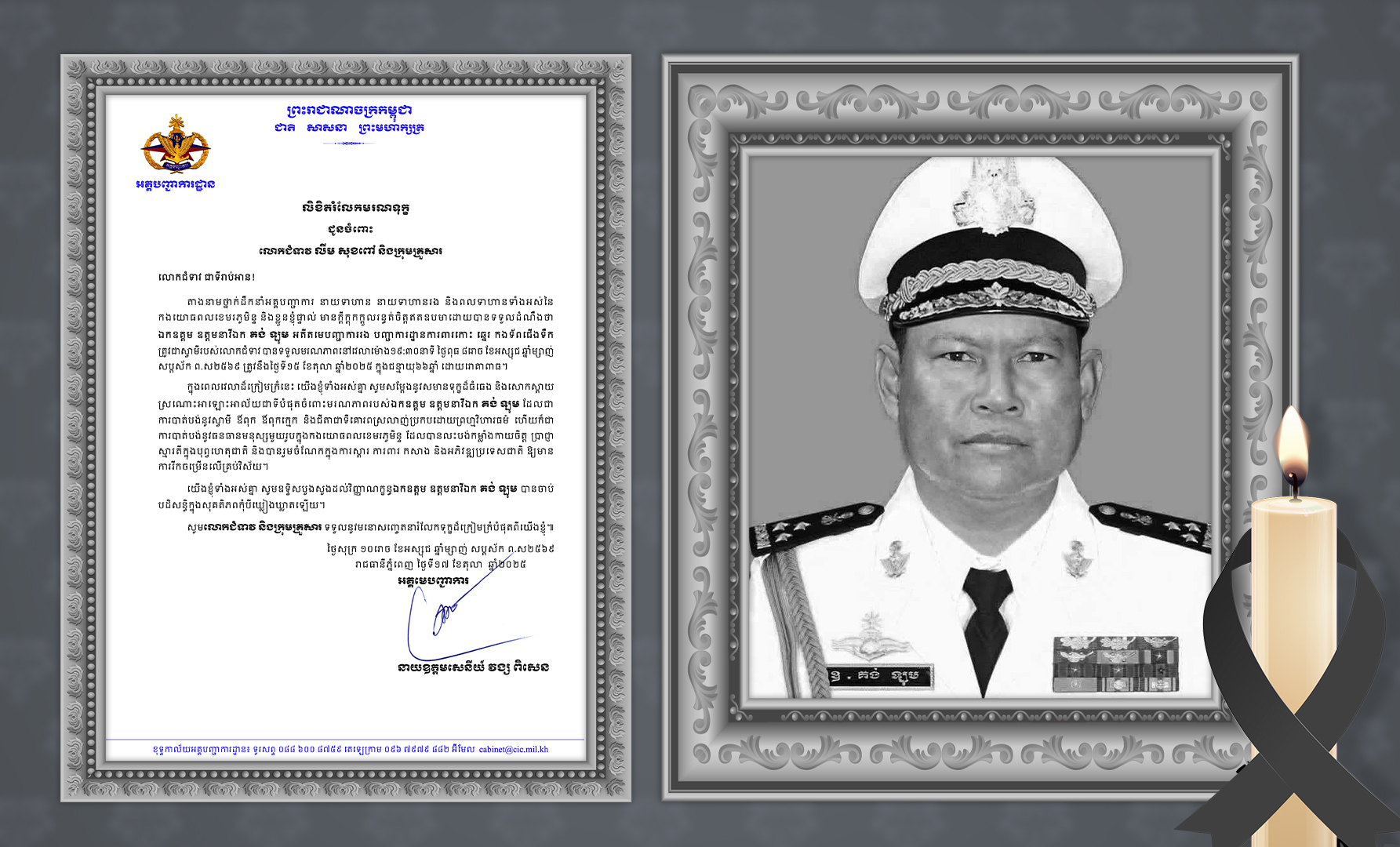 (ភ្នំពេញ)៖ ឯកឧត្ដម នាយឧត្ដមសេនីយ៍ វង្ស ពិសេន អគ្គមេបញ្ជាការនៃកងយោធពលខេមរភូមិន្ទ ព្រមទាំងថ្នាក់ដឹកនាំ នាយទាហាន នាយទាហានរង និងពលទាហានទាំងអស់នៃកងយោធពលខេមរភូមិន្ទ ផ្ញើលិខិតរំលែកទុក្ខជូន លោកជំទាវ លីម សុខពៅ និងក្រុមគ្រួសារ ចំពោះមរណភាពឯកឧត្តម ឧត្តមនាវីឯក គង់ ឡុម អតីតមេបញ្ជាការរង បញ្ជាការដ្ឋានការពារកោះឆ្នេរ កងទ័ពជើងទឹក ដែលត្រូវជាស្វាមីរបស់លោកជំទាវ បានទទួលមរណភាពនៅវេលាម៉ោង១៩:៣០នាទី ថ្ងៃពុធ ៨រោច ខែអស្សុជ ឆ្នាំម្សាញ់ សប្តស័ក ព.ស២៥៦៩ ត្រូវនឹងថ្ងៃទី១៥ ខែតុលា ឆ្នាំ២០២៥ ក្នុងជន្មាយុ៦៦ឆ្នាំ ដោយរោគាពាធ។