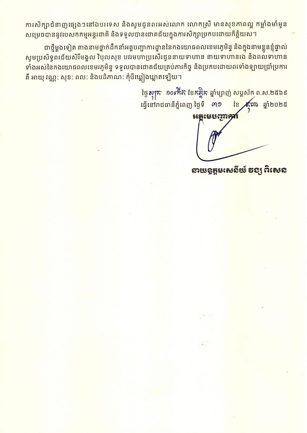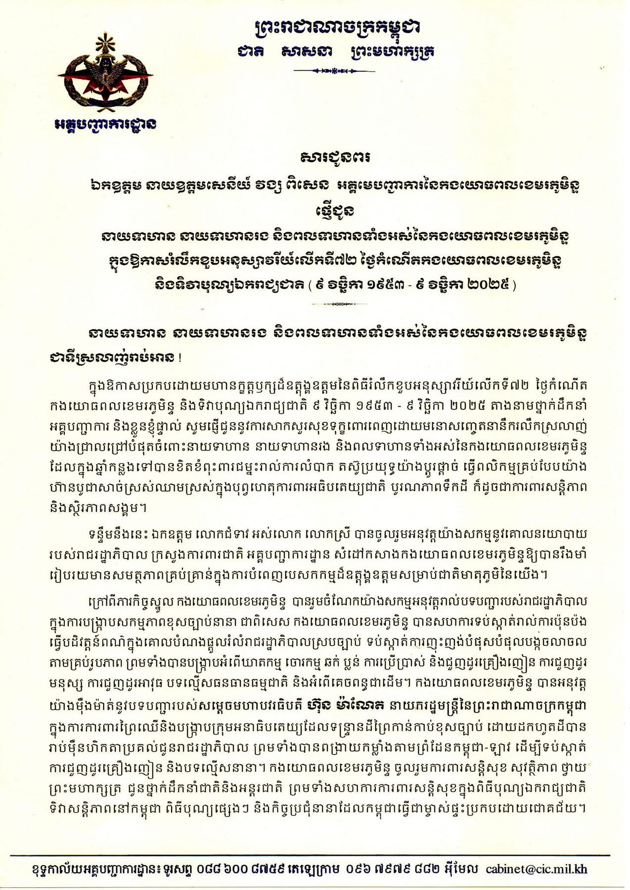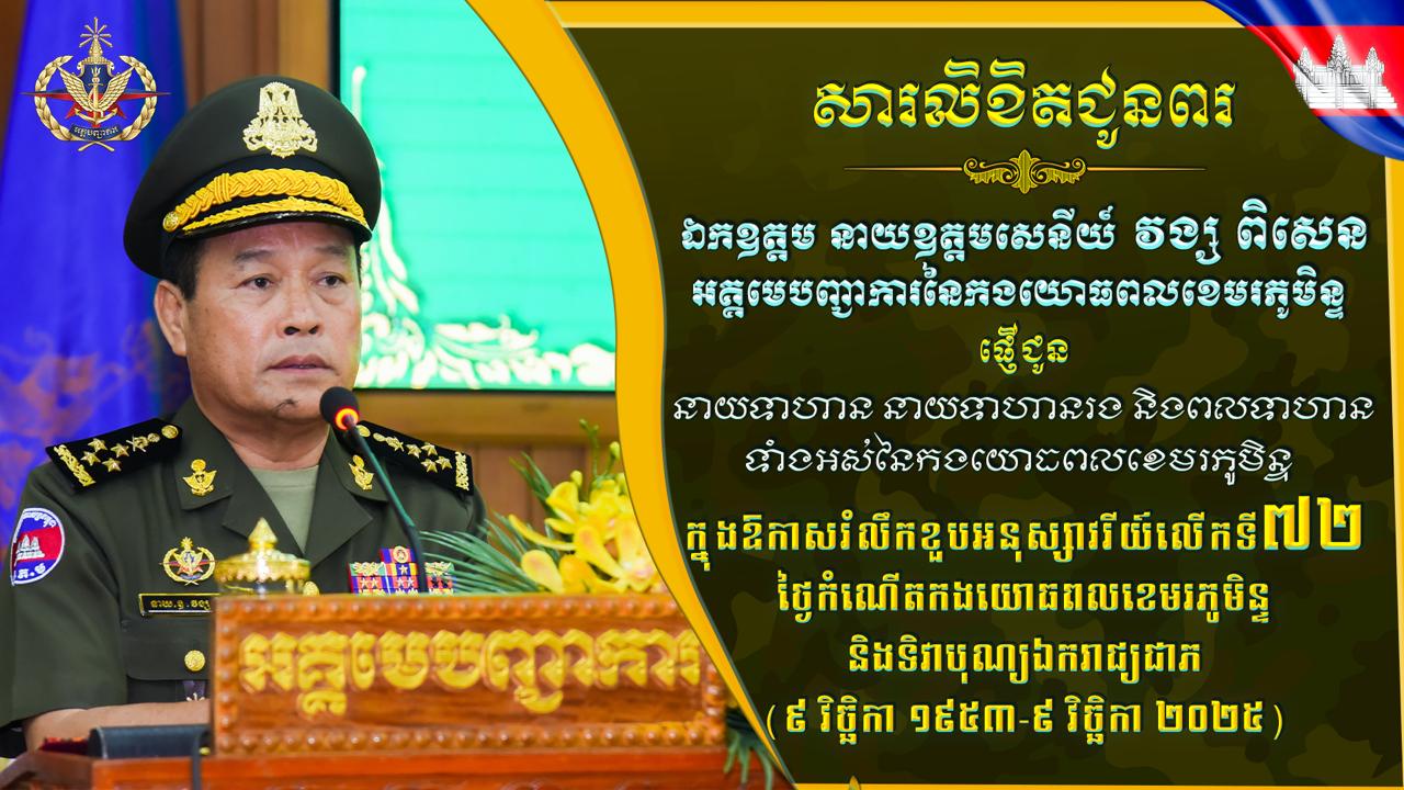 (ភ្នំពេញ)៖ ឯកឧត្ដម នាយឧត្ដមសេនីយ៍ វង្ស ពិសេន អគ្គមេបញ្ជាការនៃកងយោធពលខេមរភូមិន្ទ ផ្ញើសារជូនពរ នាយទាហាន នាយទាហានរង និងពលទាហានទាំងអស់នៃកងយោធពលខេមរភូមិន្ទ ក្នុងឱកាសខួបអនុស្សាវរីយ៍លើកទី៧២ ទិវាកំណើតកងយោធពលខេមរភូមិន្ទ និងទិវាបុណ្យឯករាជ្យជាតិ ថ្ងៃទី០៩ ខែវិច្ឆិកា ឆ្នាំ១៩៥៣-ថ្ងៃទី០៩ ខែវិច្ឆិកា ឆ្នាំ២០២៥។
