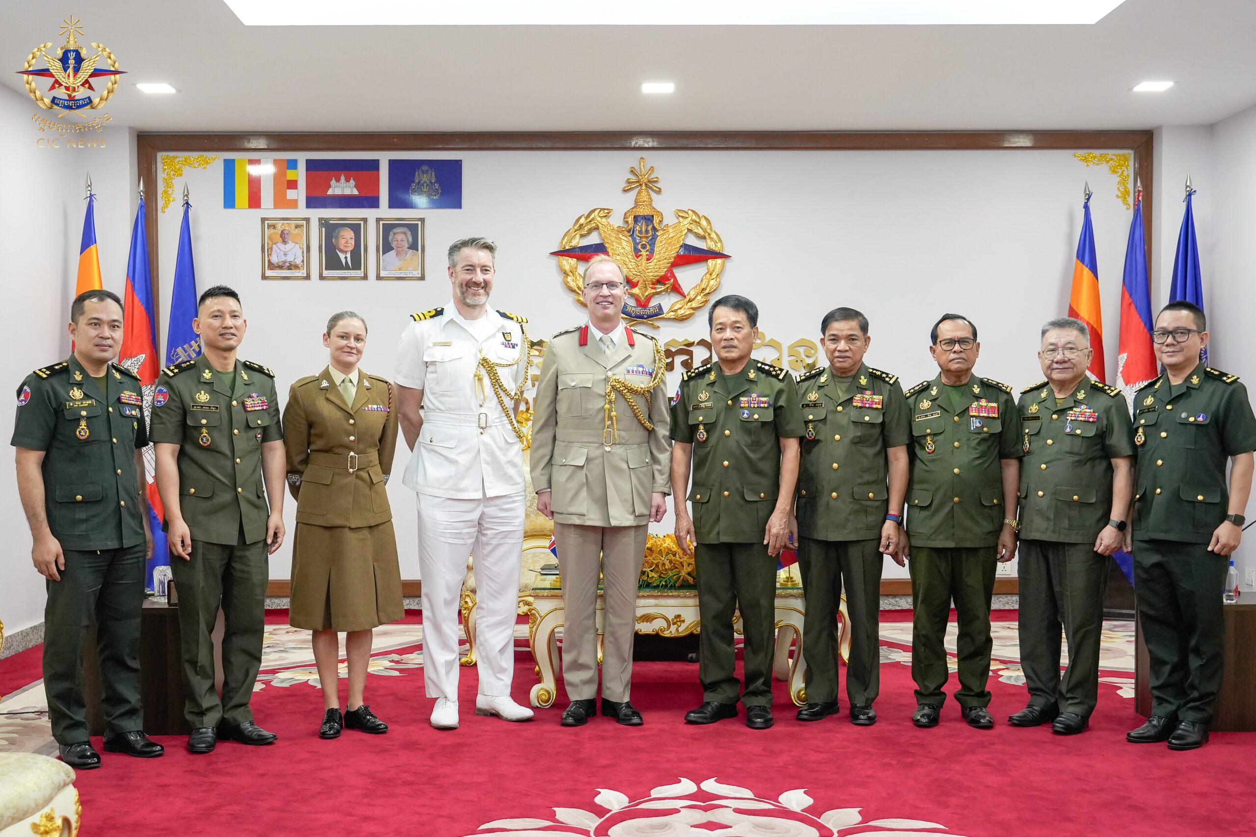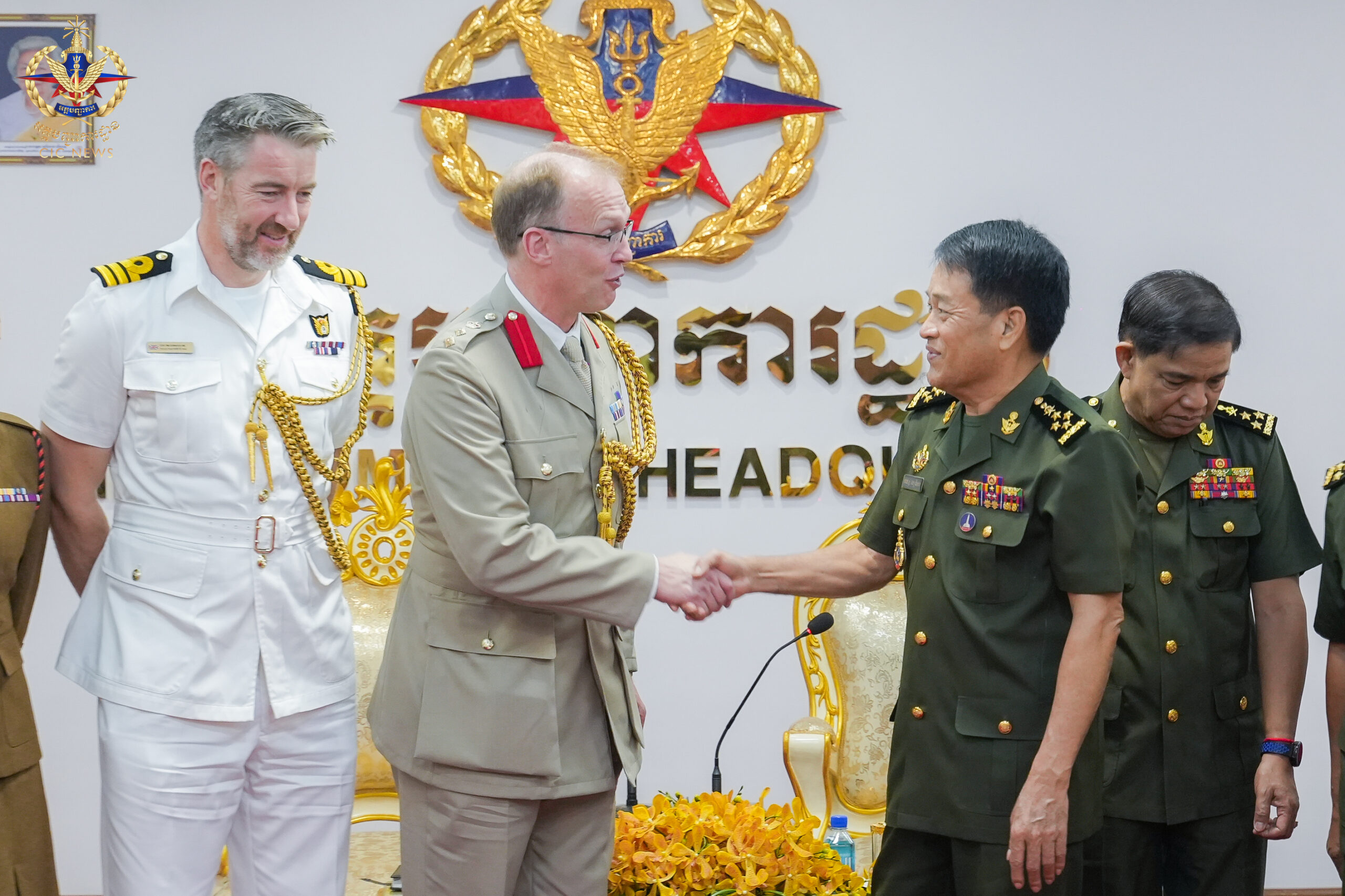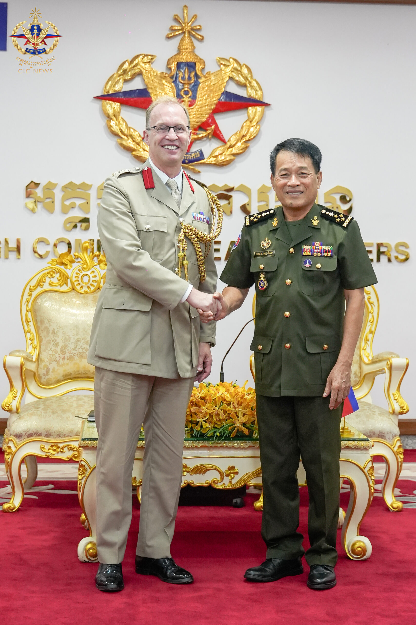 (ភ្នំពេញ)៖ នៅព្រឹកថ្ងៃទី១៨ ខែវិច្ឆិកា ឆ្នាំ២០២៥ ឯកឧត្តម នាយឧត្តមសេនីយ៍ វង្ស ពិសេន អគ្គមេបញ្ជាការ នៃកងយោធពលខេមរភូមិន្ទ បានអនុញ្ញាតឱ្យលោក វរសេនីយ៍ឯក ជូលៀន អ.អិល.ស្មីត សេនានុព័ន្ធចក្រភពអង់គ្លេសថ្មីប្រចាំកម្ពុជា ដែលមាននិវេសនដ្ឋាននៅក្រុងហាណូយ ប្រទេសវៀតណាម ចូលជួបសម្តែងការគួរសម និងពិភាក្សាការងារ នៅអគ្គបញ្ជាការដ្ឋាន។