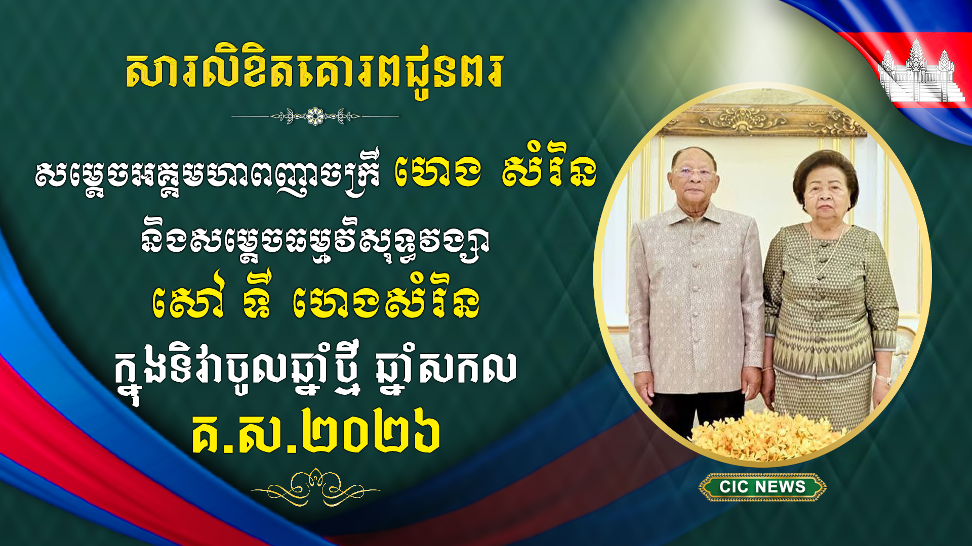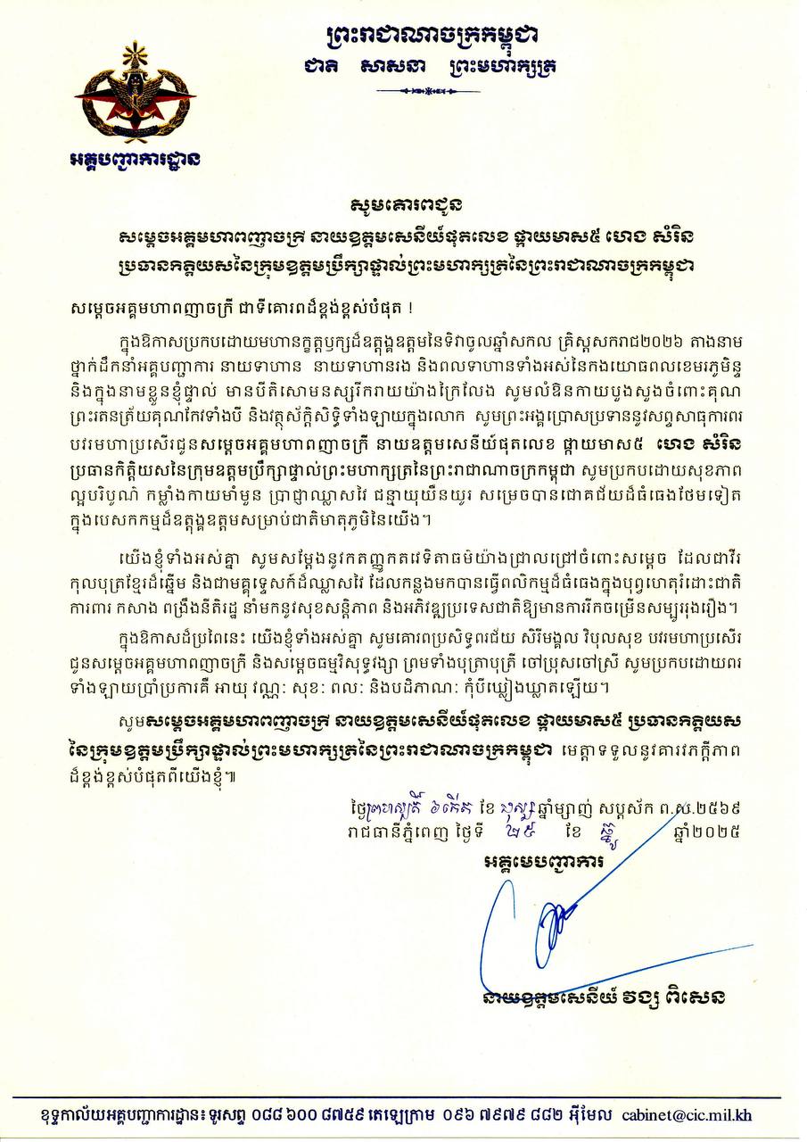 ឯកឧត្ដម នាយឧត្ដមសេនីយ៍ វង្ស ពិសេន ផ្ញើសារលិខិតគោរពជូនពរ សម្ដេចអគ្គមហាពញាចក្រី ហេង សំរិន និងសម្ដេចធម្មវិសុទ្ធវង្សា សៅ ទី ហេងសំរិន ក្នុងឱកាសចូលឆ្នាំសកល ២០២៦