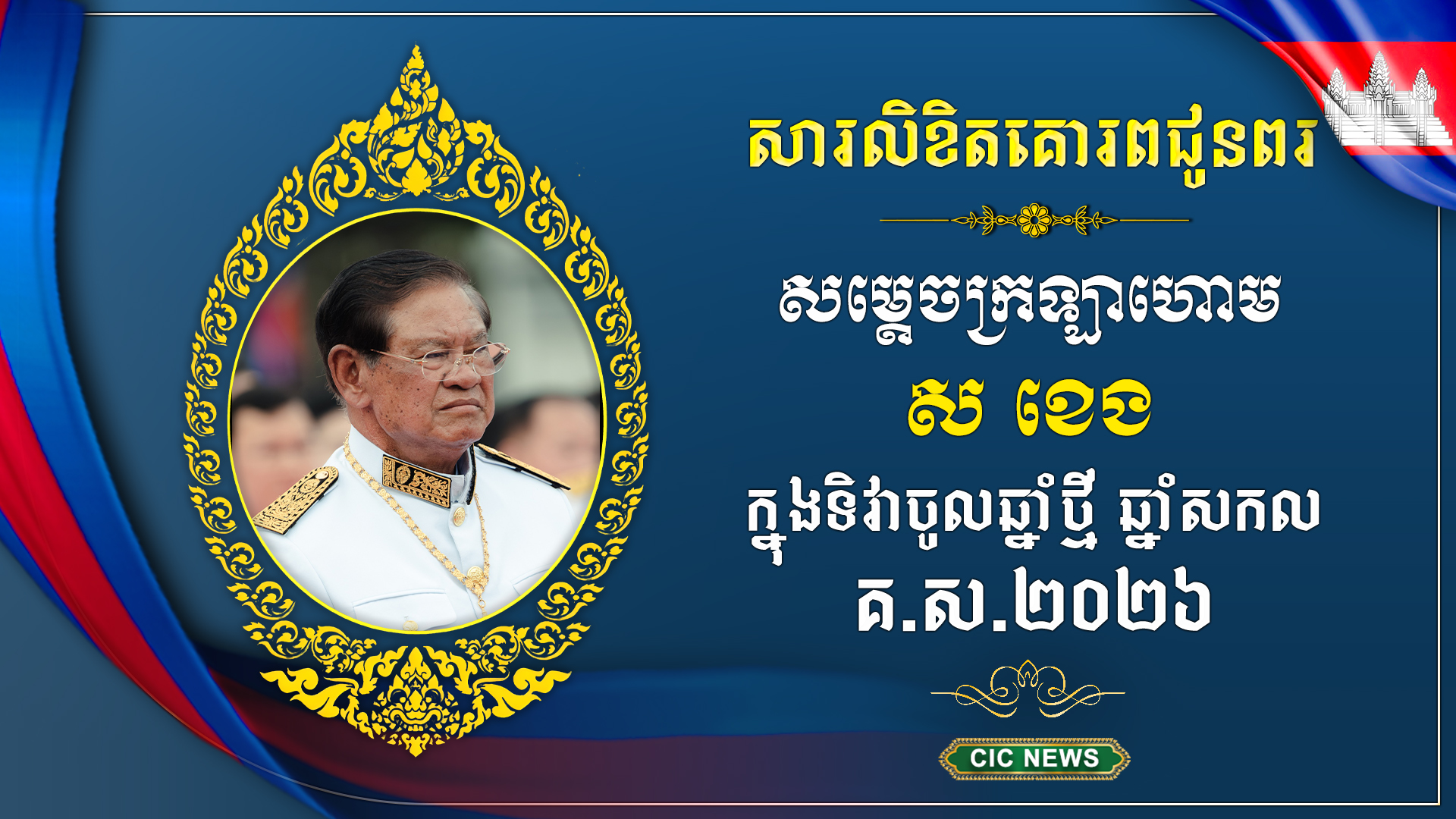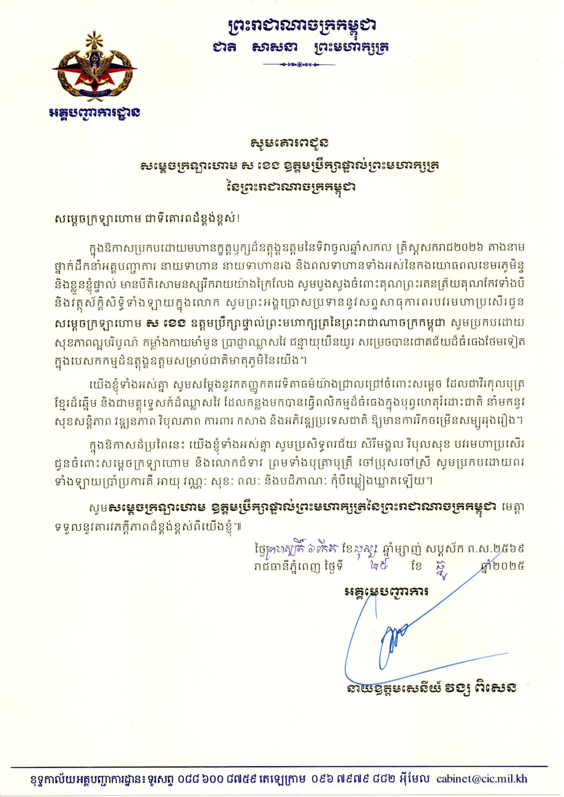 (ភ្នំពេញ)៖ ឯកឧត្ដម នាយឧត្ដមសេនីយ៍ វង្ស ពិសេន អគ្គមេបញ្ជាការនៃកងយោធពលខេមរភូមិន្ទ ព្រមទាំងនាយទាហាន នាយទាហានរង និងពលទាហានទាំងអស់នៃកងយោធពលខេមរភូមិន្ទ បានផ្ញើសារលិខិតគោរពជូនពរ សម្ដេចក្រឡាហោម ស ខេង ឧត្តមប្រឹក្សាផ្ទាល់ព្រះមហាក្សត្រនៃព្រះរាជាណាចក្រកម្ពុជា និងលោកជំទាវ ក្នុងឱកាសចូលឆ្នាំថ្មី ឆ្នាំសកល គ.ស.២០២៦។