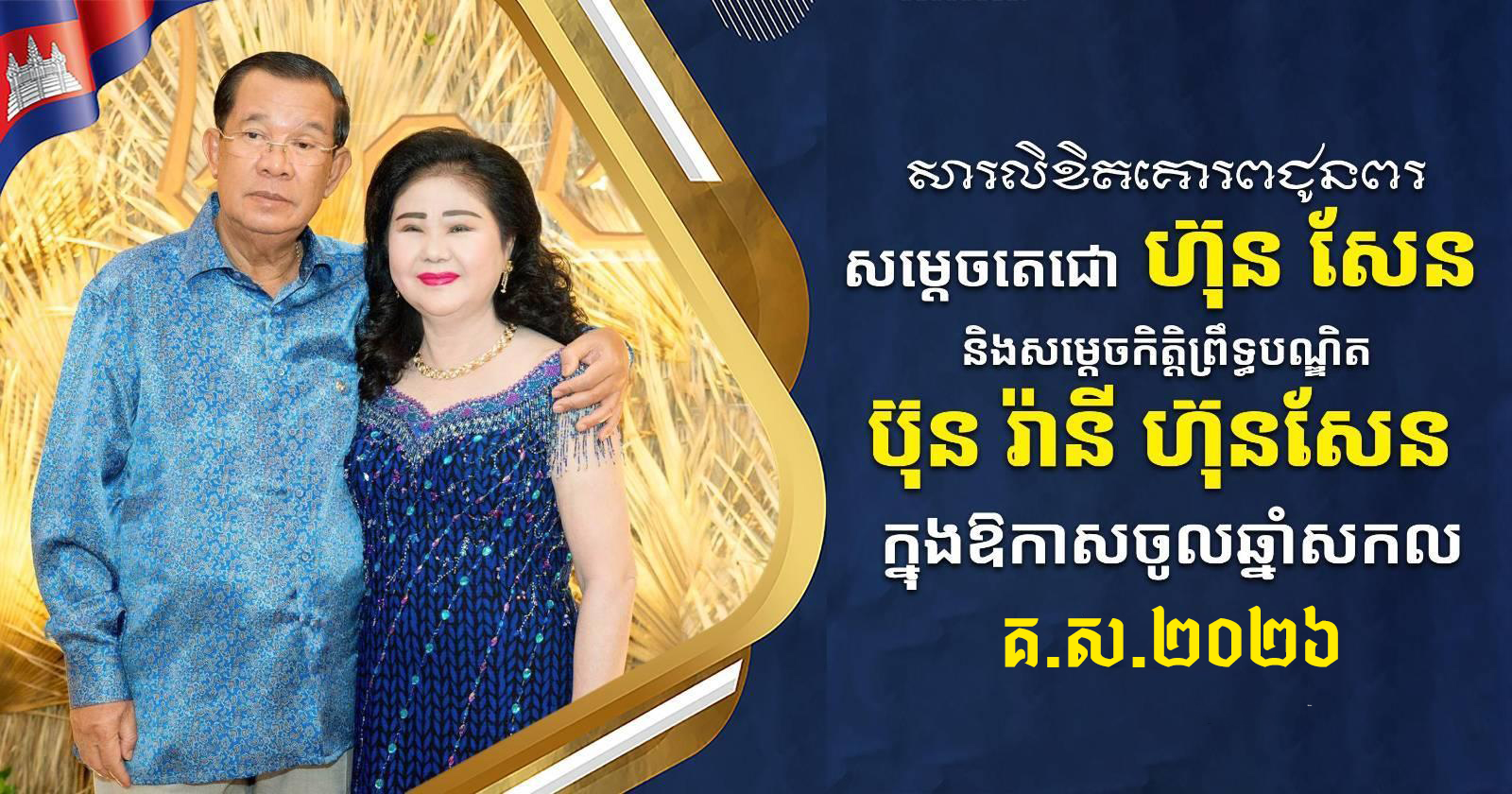 ក្នុងឱកាសដ៏មហោឡារិកនេះ យើងខ្ញុំទាំងអស់គ្នាសូមបួងសួងដល់គុណបុណ្យ ព្រះរតនត្រ័យកែវទាំងបី វត្ថុស័ក្ដិសិទ្ធិក្នុងលោក និងទេវតាឆ្នាំថ្មី សូមប្រោះព្រំសព្ទសាធុការពរ សិរីសួស្ដី ជ័យមង្គលវិបុលសុខ បវរមហាប្រសើរថ្លៃថ្លាជូនចំពោះ សម្ដេចតេជោ និងសម្ដេចកិត្តិព្រឹទ្ធបណ្ឌិត សូមមានសុខភាពល្អបរិបូរណ៍ កម្លាំងពលំមាំមួន ប្រាជ្ញាភ្លឺថ្លា ជន្មាយុយឺនយូរ ឈ្នះអស់មារសត្រូវគ្រប់ទិសទី និងទទួលបានជោគជ័យថ្មីបន្ថែមទៀតក្នុងបុព្វហេតុជាតិ មាតុភូមិ ប្រជាជនប្រកបដោយការអភិវឌ្ឍ និងរីកចម្រើនតរៀងទៅ។