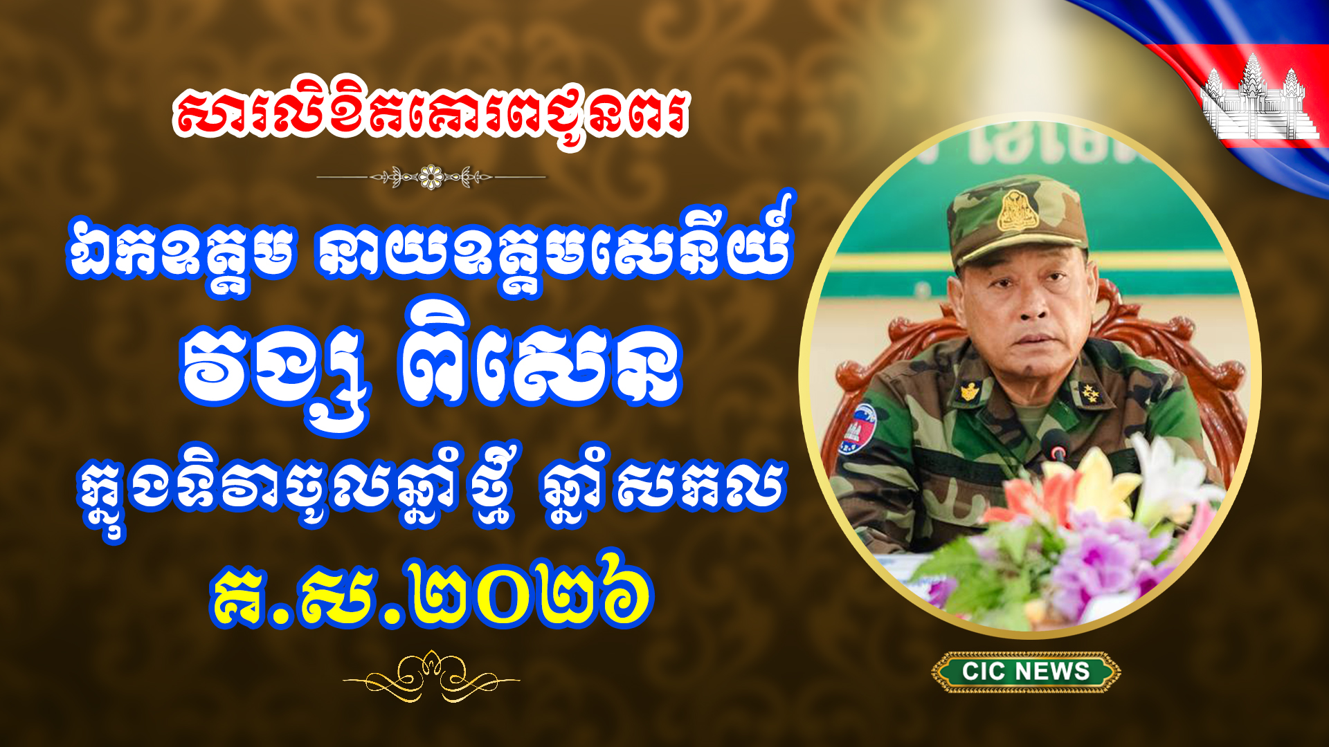 (ភ្នំពេញ)៖ ឯកឧត្ដម ឧត្ដមសេនីយ៍ឯក ជីម សុខ នាយរងសេនាធិការចម្រុះ និងជានាយកទីចាត់ការបុគ្គលិក អគ្គបញ្ជាការ ព្រមទាំងនាយទាហាន នាយទាហានរង និងពលទាហានទាំងអស់ បានផ្ញើសារលិខិតគោរពជូនពរ ឯកឧត្ដម នាយឧត្ដមសេនីយ៍ វង្ស ពិសេន អគ្គមេបញ្ជាការនៃកងយោធពលខេមរភូមិន្ទ និងលោកជំទាវ ក្នុងឱកាសចូលឆ្នាំថ្មី ឆ្នាំសកល គ.ស.២០២៦។
