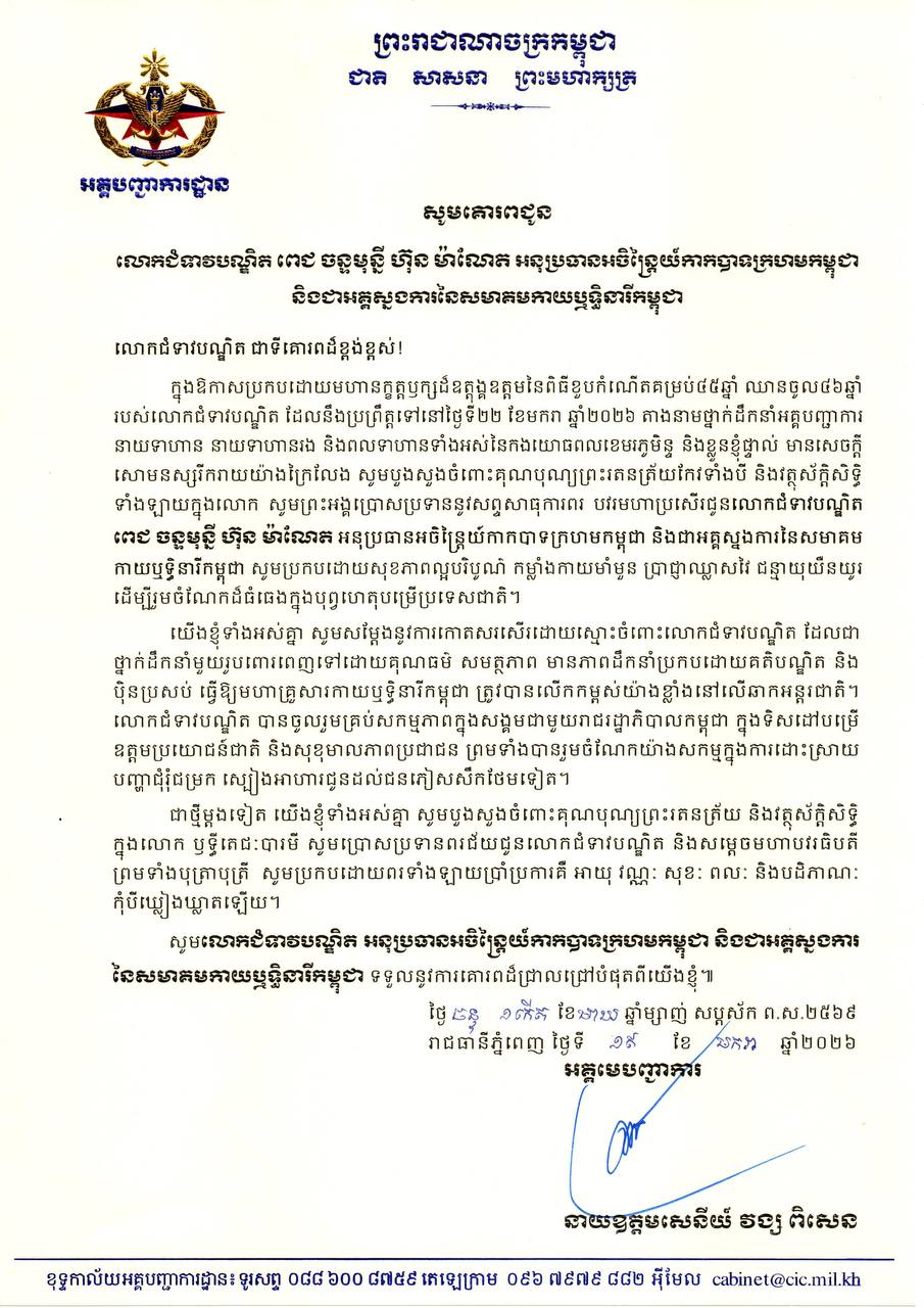 (ភ្នំពេញ)៖ ឯកឧត្ដម នាយឧត្ដមសេនីយ៍ វង្ស ពិសេន អគ្គមេបញ្ជាការ កងយោធពលខេមរភូមិន្ទ ព្រមទាំងថ្នាក់ដឹកនាំ នាយទាហាន នាយទាហានរង និងពលទាហានទាំងអស់នៃកងយោធពលខេមរភូមិន្ទ សូមបួងសួងដល់វត្ថុស័ក្តិសិទ្ធិក្នុងលោកតាមជួយបីបាច់ថែរក្សា និងប្រសិទ្ធិពរជ័យសិរីមង្គល មហាប្រសើរជូនចំពោះ លោកជំទាវបណ្ឌិត ពេជ ចន្ទមុន្នី ហ៊ុន ម៉ាណែត អនុប្រធានអចិន្ត្រៃយ៍កាកបាទក្រហមកម្ពុជា និងជាអគ្គស្នងការនៃសមាគមកាយឬទ្ធិនារីកម្ពុជា ក្នុងឱកាសចម្រើនជន្មាយុគម្រប់៤៥ ឈានចូល ៤៦ឆ្នាំ នៅថ្ងៃទី២២ ខែមករា ឆ្នាំ២០២៦។